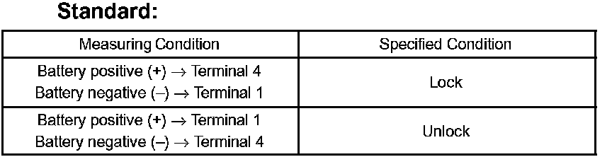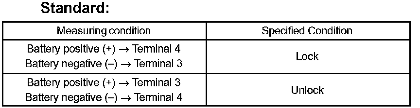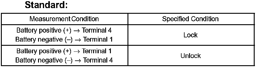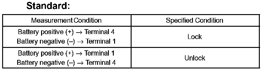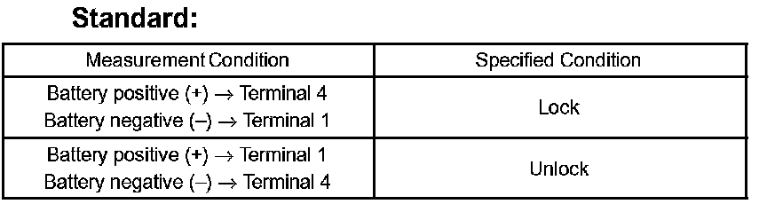 a. Apply battery voltage and inspect the door lock motor operation, as shown in the illustration and table.