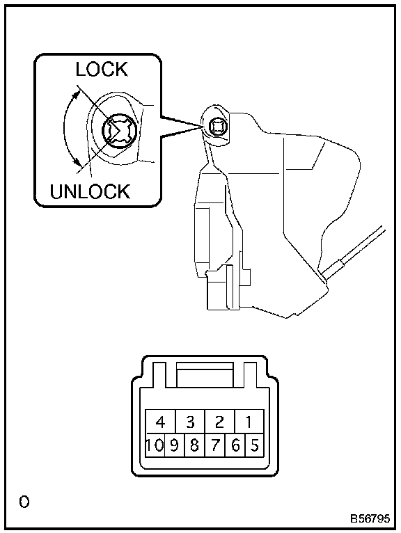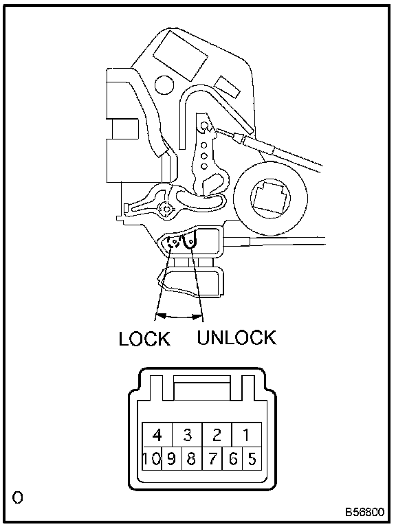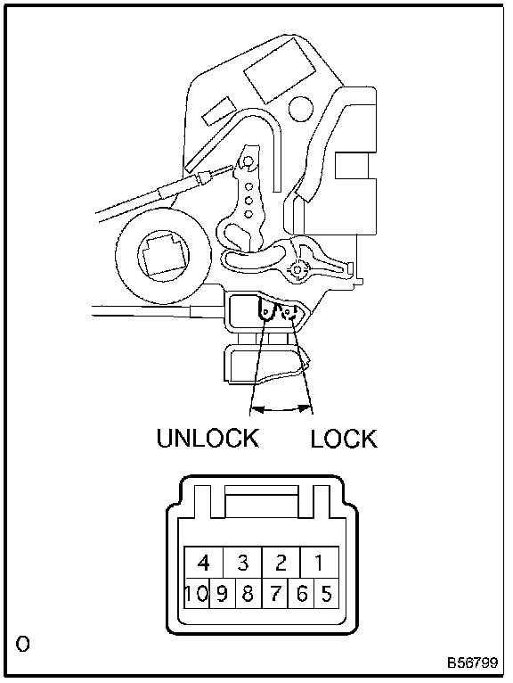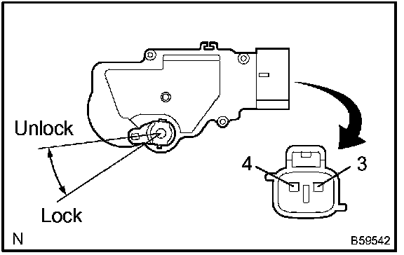 a. Apply battery voltage and inspect the back door lock actuator assembly operation, as shown in the illustration and table.