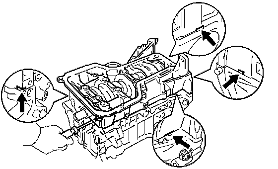 d) Using a screwdriver, remove the bearing cap by prying the indicated portions between the cylinder block and bearing cap.