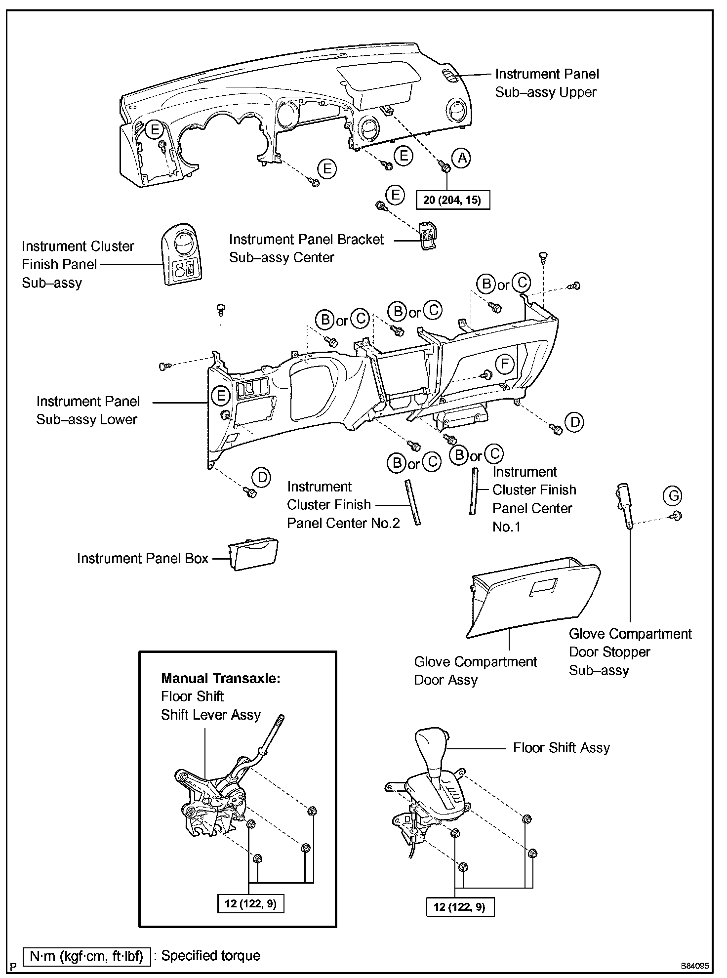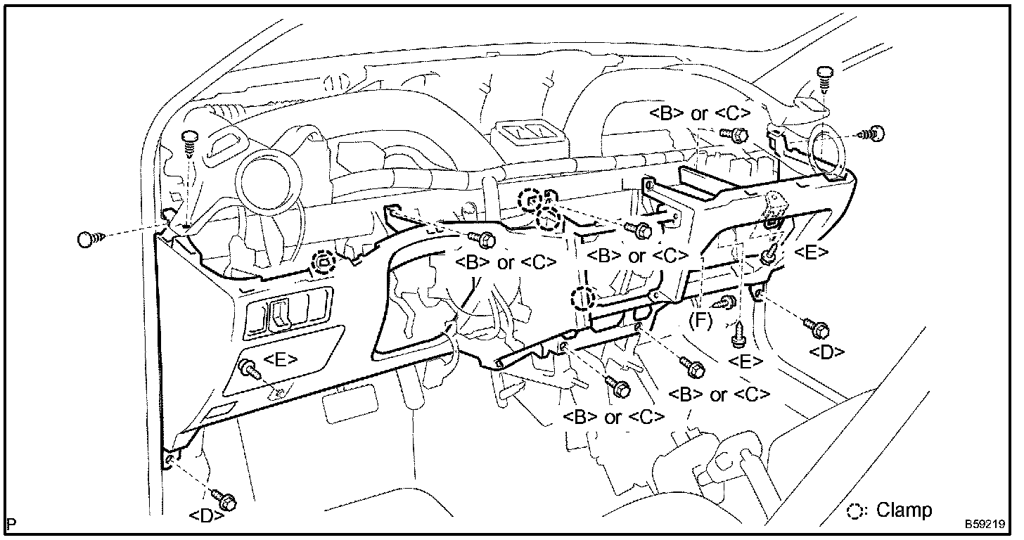 HINT: Indicate the bolts, screws and nuts, which are necessary for installation and removal of the instrument panel, in the illustration and the text with alphabets.