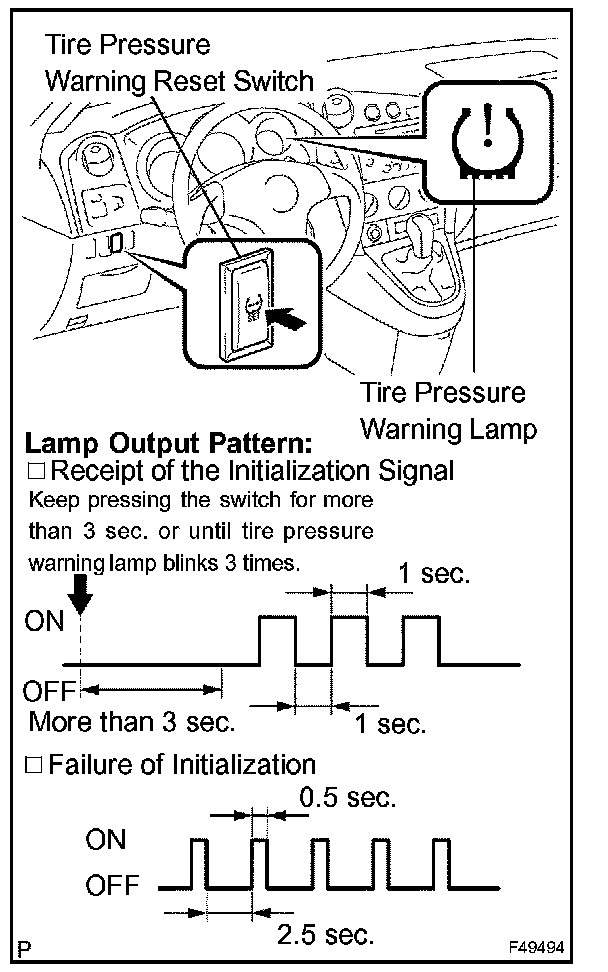 HINT: If the tire pressure warning lamp repeats a cycle of ON (0.5 sec.) and OFF (2.5 sec.) while the vehicle is being driven, initialization may have failed. If so, perform the initialization again. (Turn the ignition switch off and retry from step 1-(a).)