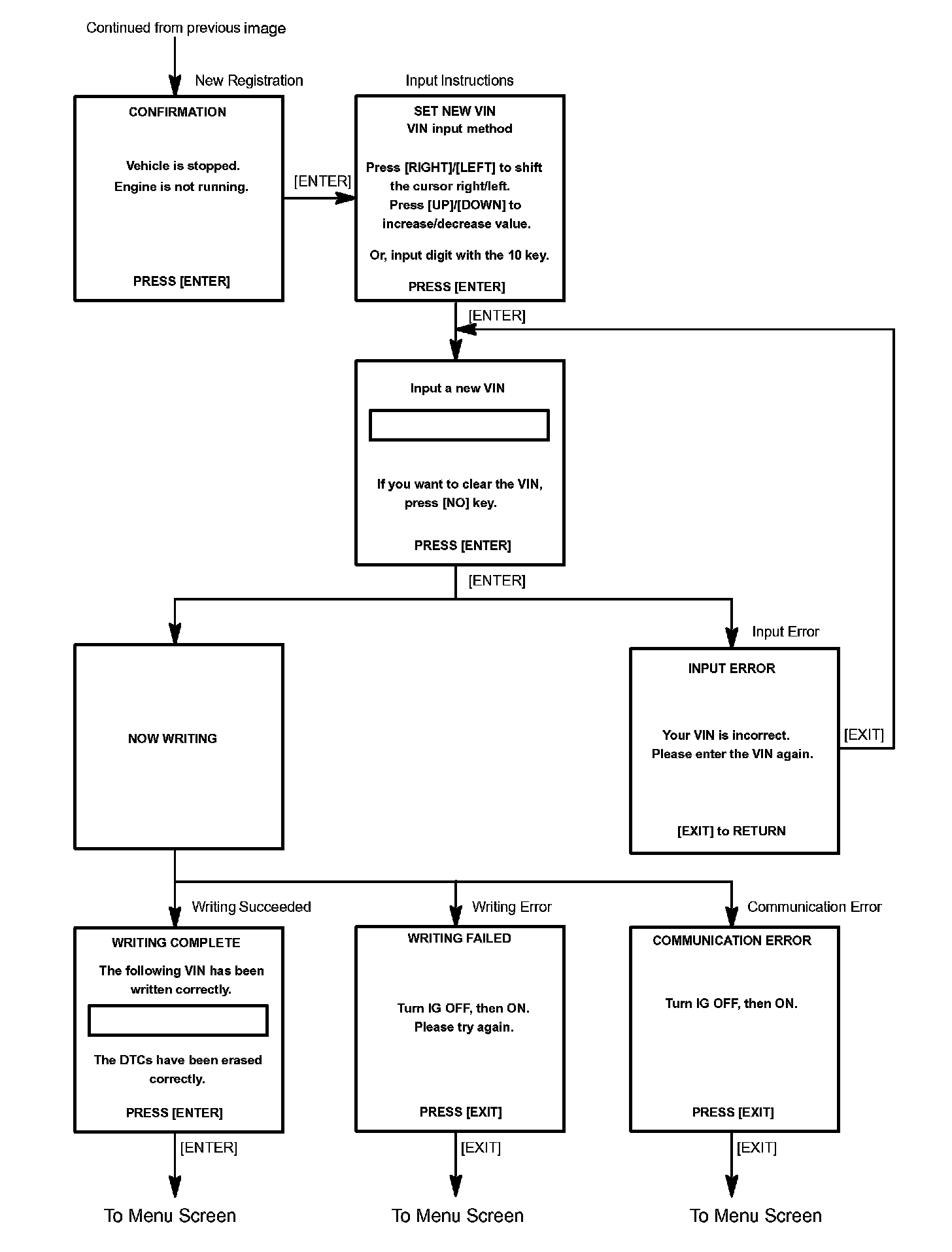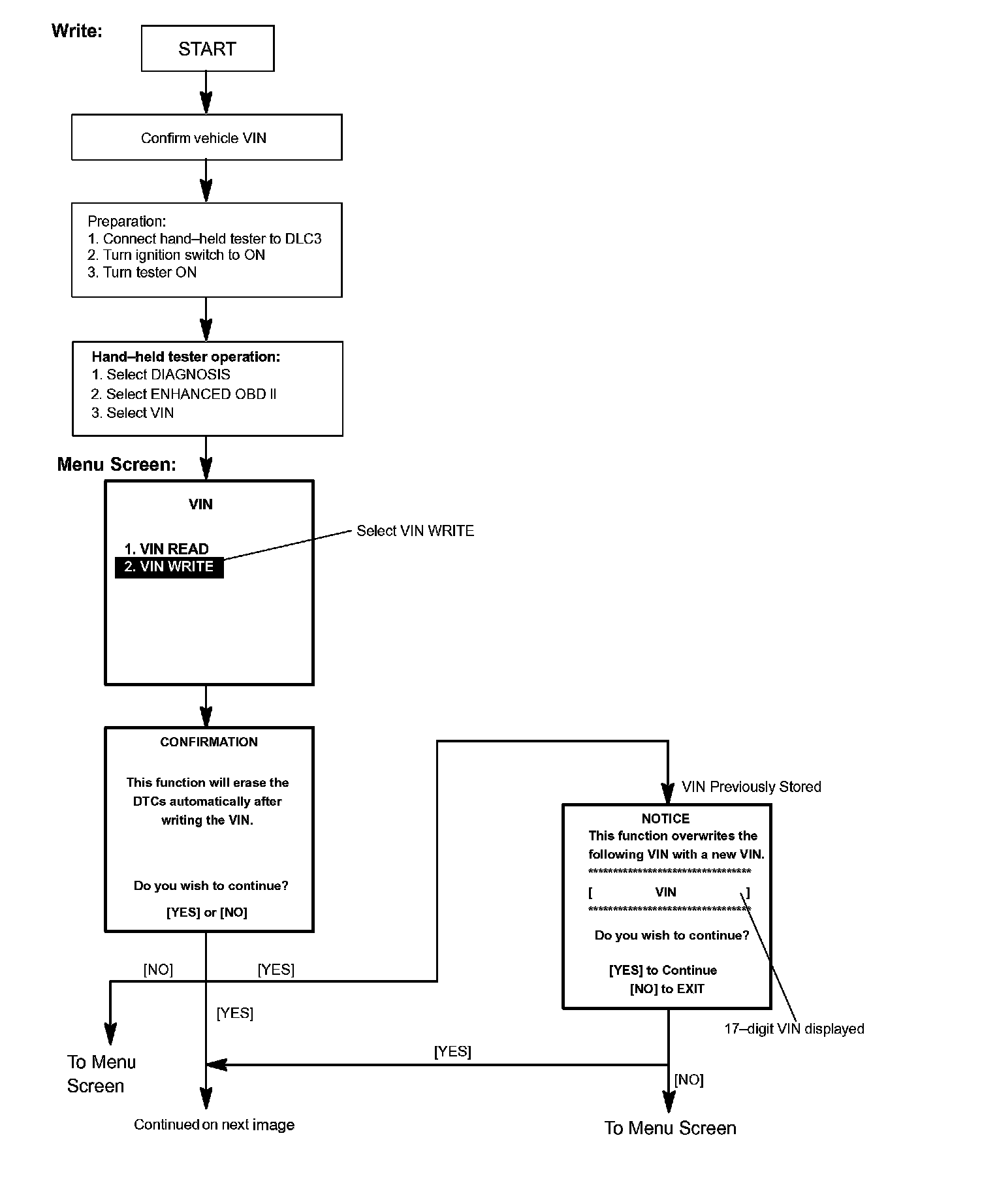 c. Write VIN: Explains the VIN writing process in a flowchart. This process allows the VIN to be input into the ECM. If the ECM is changed, or the VINs do not match, the VIN can be registered, or overwritten in the ECM by following this procedure.