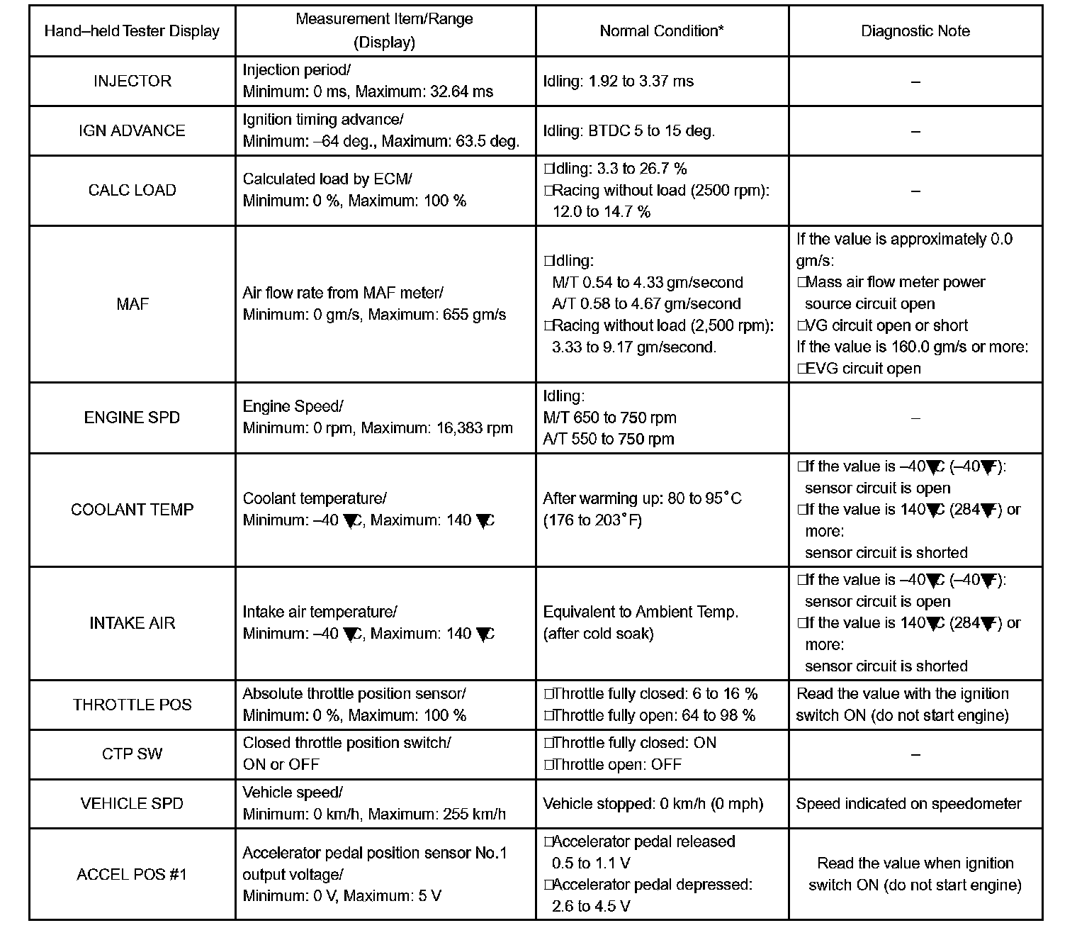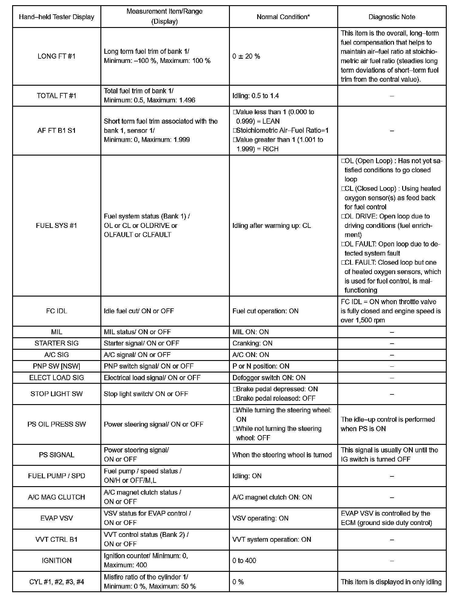DATA LISTHINT: Using the hand-held tester's DATA LIST allows switch, sensor, actuator and other item values to be read without removing any parts. Reading the DATA LIST early in troubleshooting is one way to save time.