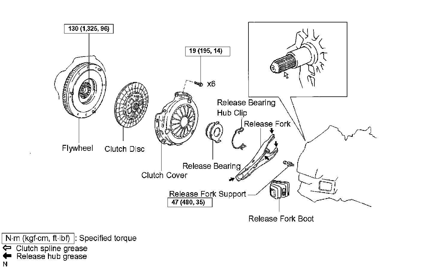 a) Apply release hub grease to the release fork, release bearing assembly, push rod contact point and pivot points as shown in the illustration.