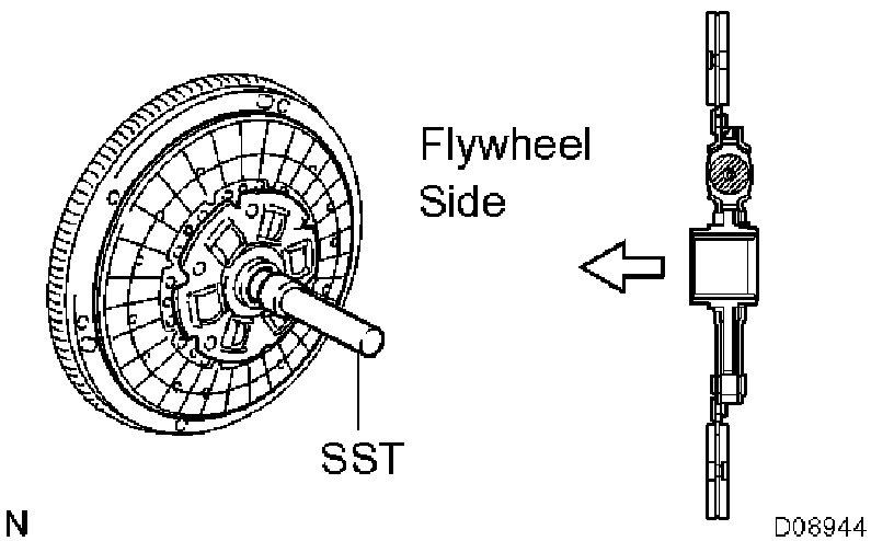 a) Insert SST into the clutch disc assembly, then insert them into the flywheel sub-assembly.