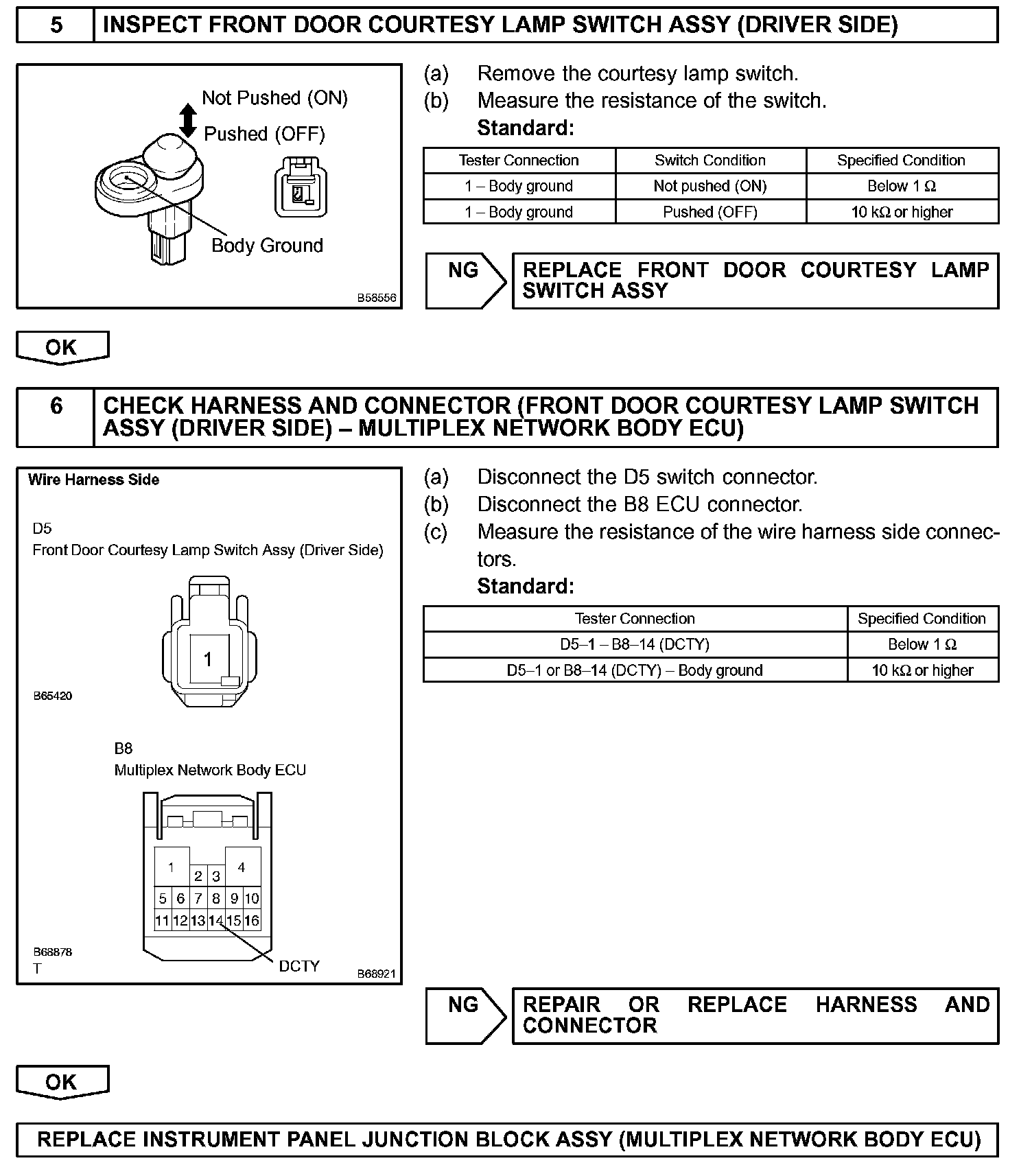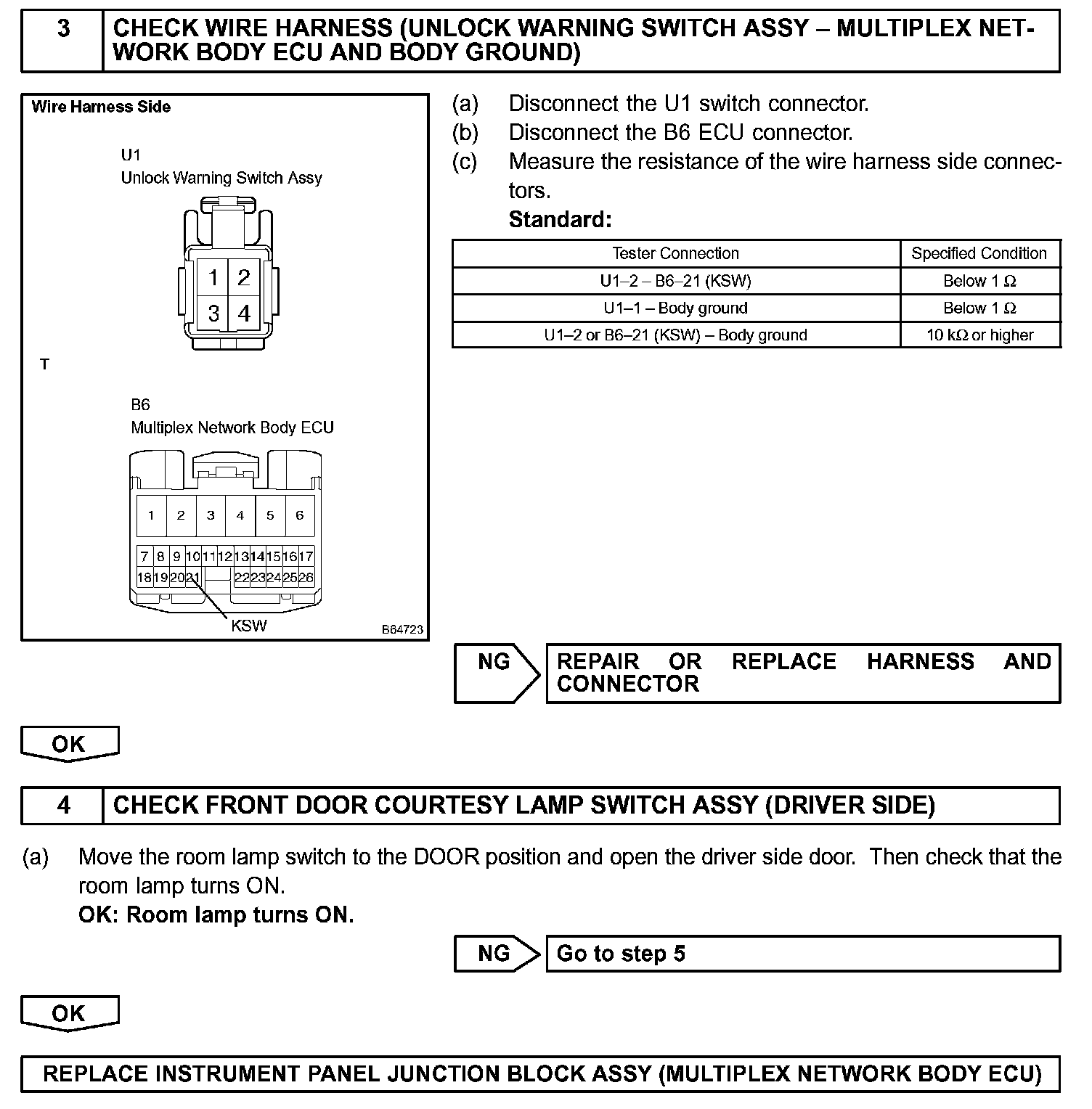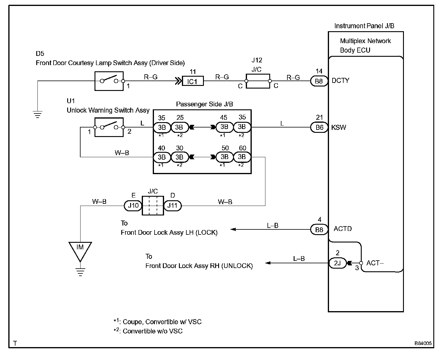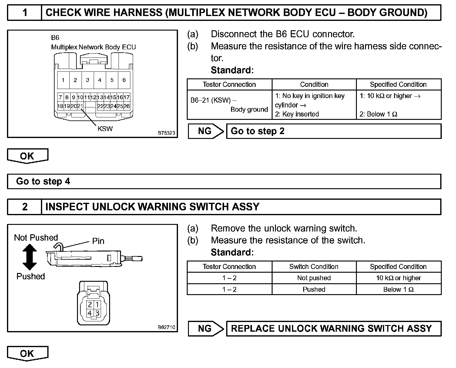 To prevent the key from being locked in the vehicle, the body ECU prevents doors from being locked by monitoring 2 switches: 1) the unlock warning switch, which turns ON when the key is inserted into the ignition key cylinder; and 2) the driver side courtesy lamp switch, which turns ON when the driver side door is opened.