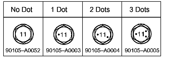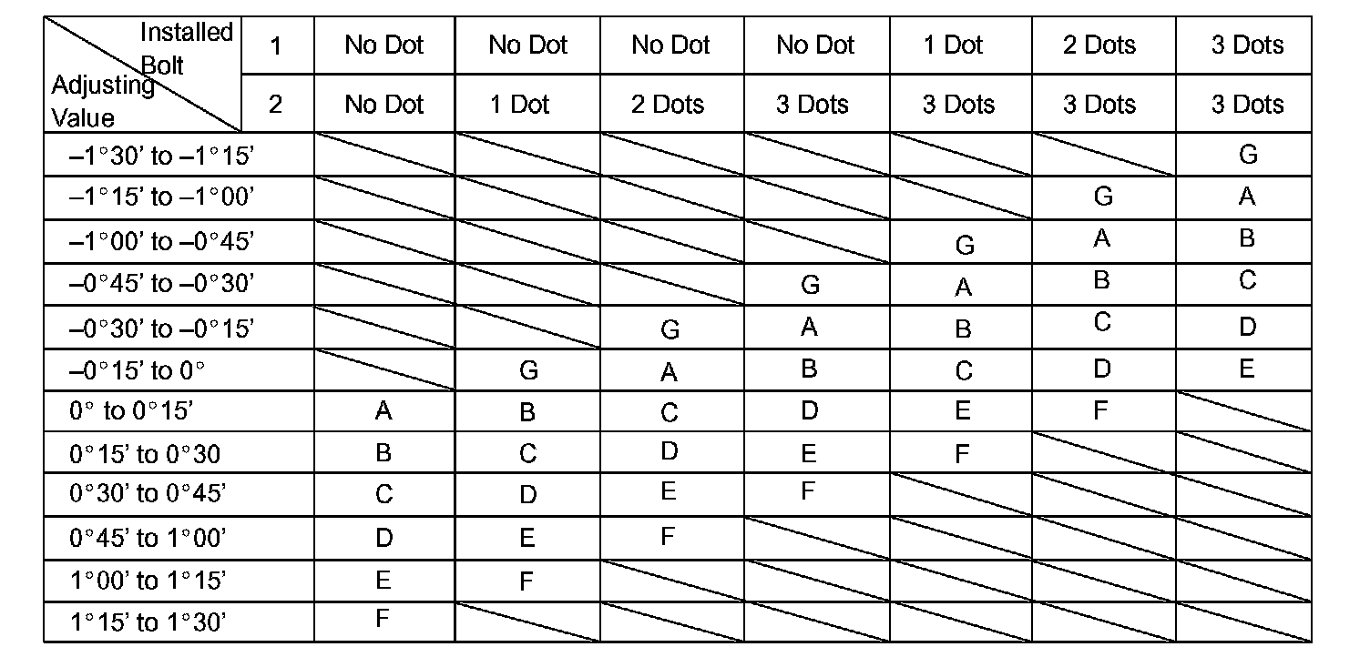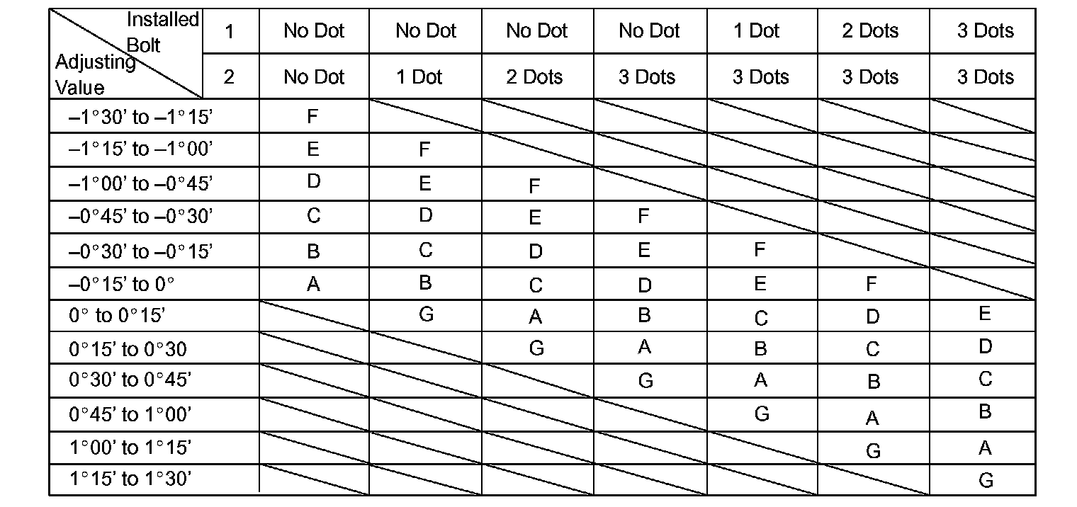 Check installed bolts combination. Select appropriate bolts from the table below to adjust the camber to within the specified range.