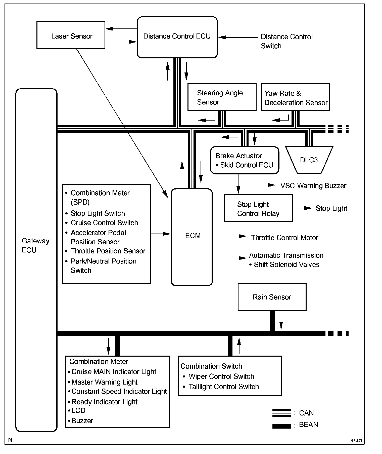The distance control ECU (cruise control ECU) determines the distance between a vehicle in front and your own, relative speed, target decreasing speed and deceleration rate to transmit a brake demand signal to the skid control ECU via the ECM.