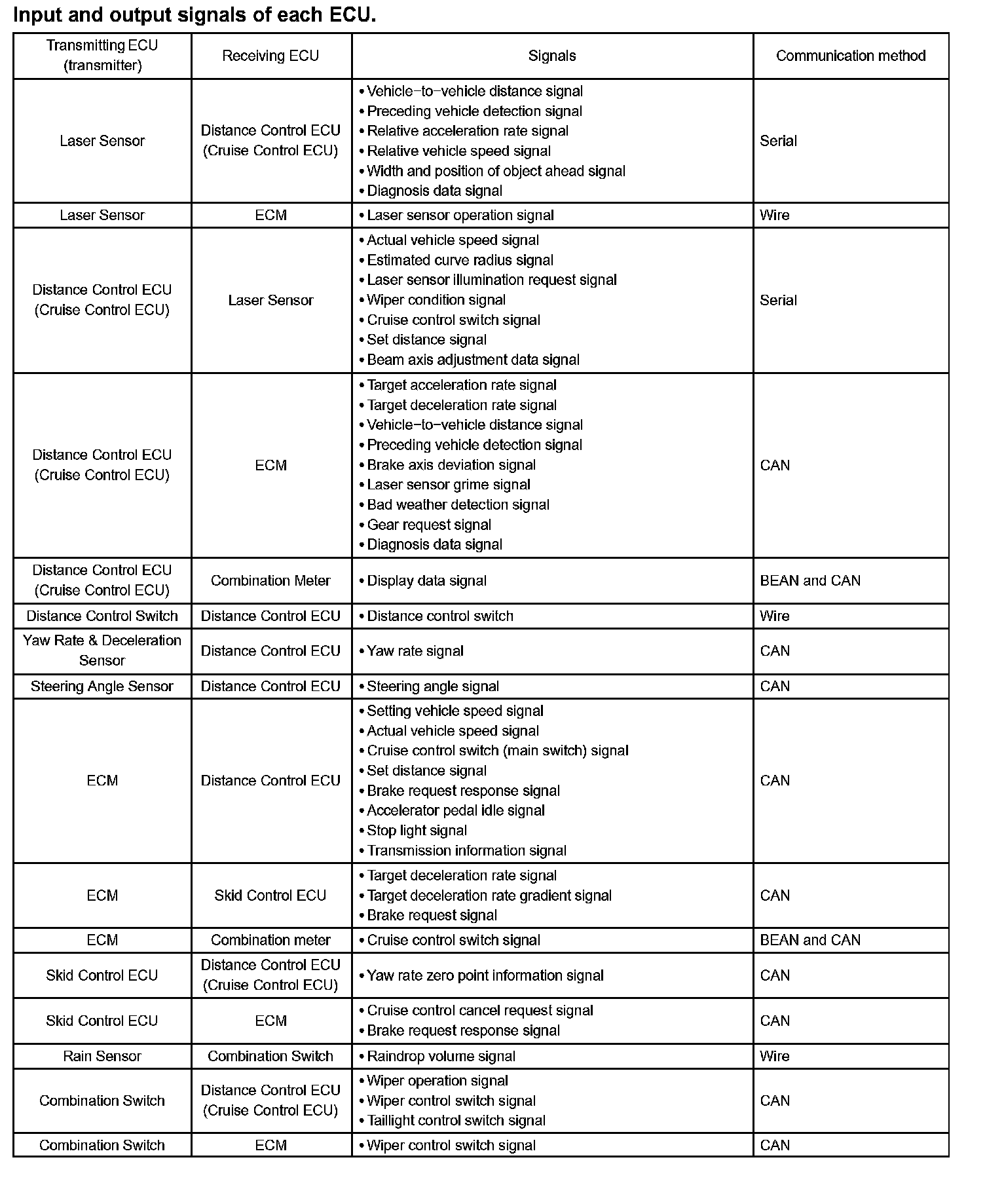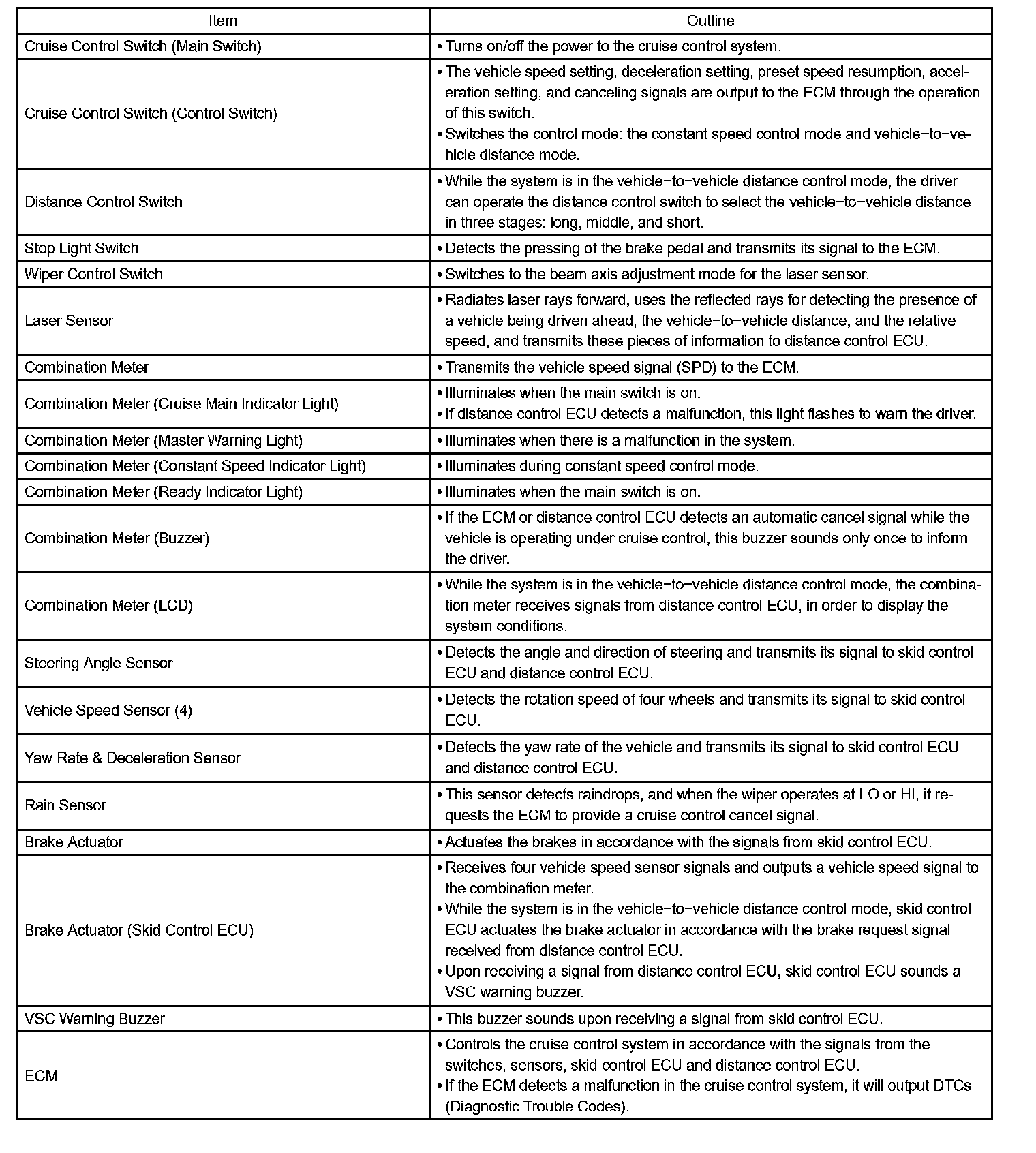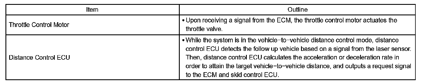 d. The laser sensor and the distance control ECU (cruise control ECU) control the system while the vehicle- to-vehicle distance control mode is in operation, and send signals to each actuator and ECU.