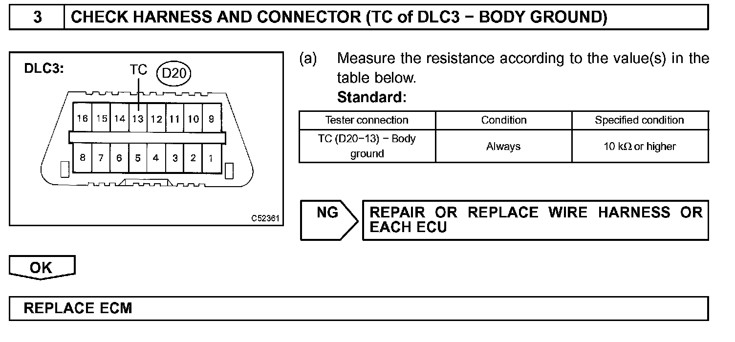 HINT: When a particular warning light stays blinking, a ground short in the wiring of terminal TC of the DLC3 or an internal ground short in the relevant ECU is suspected.