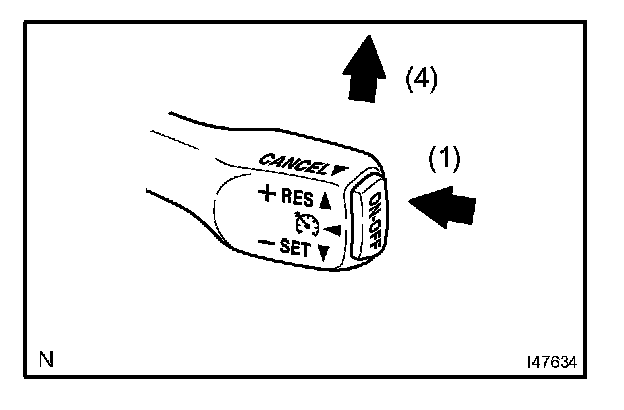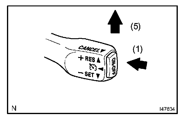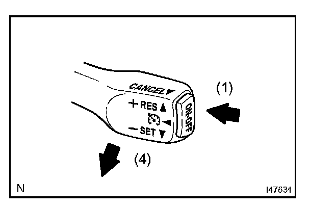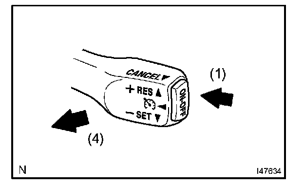4. Check that vehicle speed decreases while the cruise control main switch is pushed to SET/-, and that the vehicle cruises at the newly set speed when the switch is released.