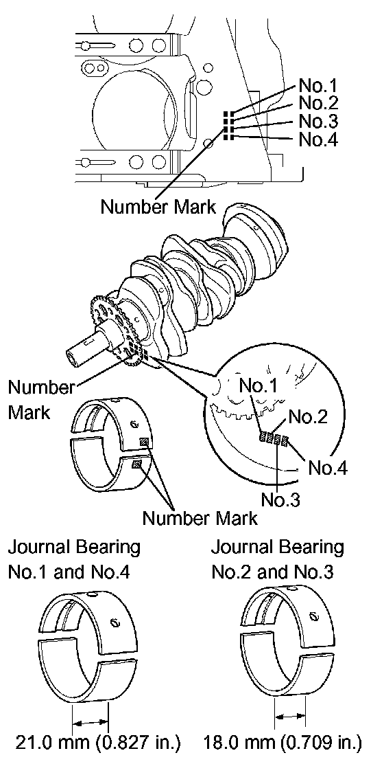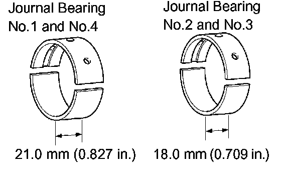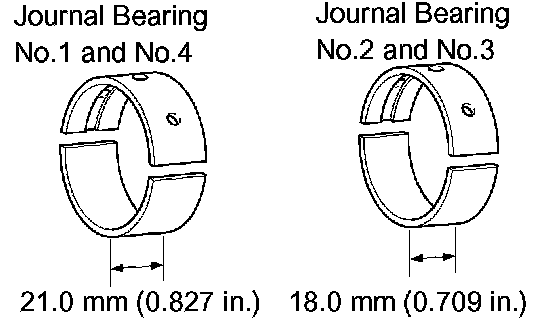 NOTICE: Main bearings come in widths of 18.0 mm (0.709 inch) and 21.0 mm (0.827 inch). Install the 21.0 mm (0.827 inch) bearings in the No.1 and No.4 cylinder block journal positions with the main bearing cap. Install the 18.0 mm (0.709 inch) bearings in the No.2 and No.3 positions.