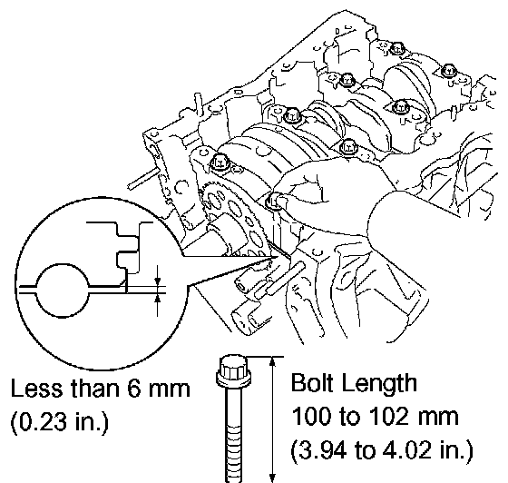 i. Insert the main bearing cap by hand by using the 2 internal bearing cap bolts as a guide, until the clearance between the main bearing cap and the cylinder block will become less than 6 mm (0.23 inch).