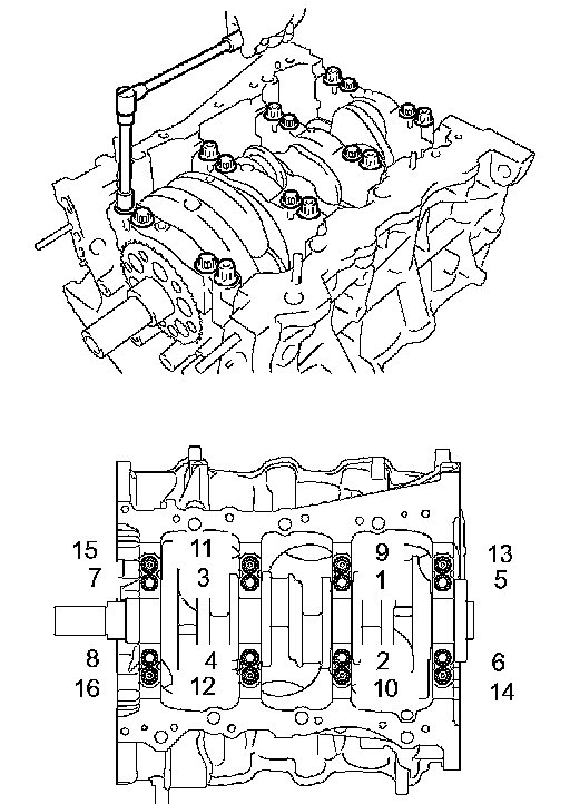 m. Install and uniformly tighten the 16 main bearing cap bolts in several steps and in the sequence shown in the illustration.