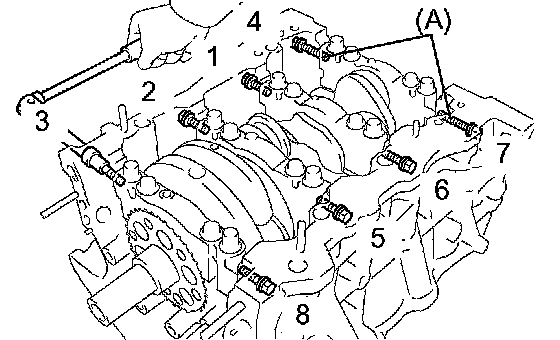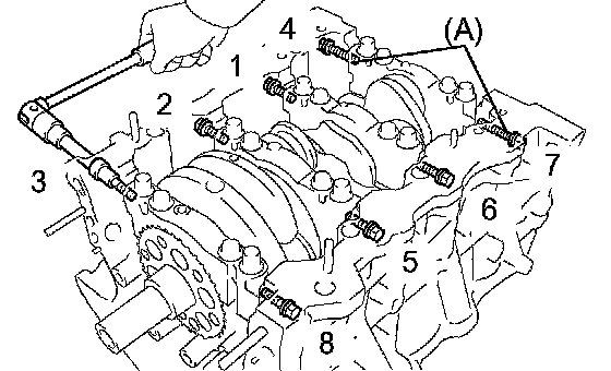 q. Install and uniformly tighten the 8 main bearing cap bolts in several steps and in the sequence shown in the illustration.