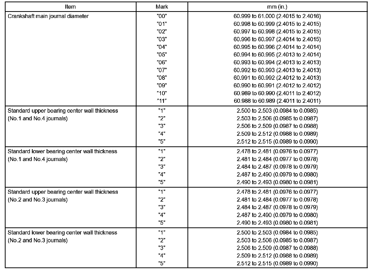 t. If using a bearing, replace it with one that has the same number. If the number of the bearing cannot be determined, select the correct bearing by adding together the numbers imprinted on the cylinder block and crankshaft, then refer to the table for the appropriate bearing number. There are 5 sizes of standard bearings, marked "1", "2", "3", "4" and "5" accordingly