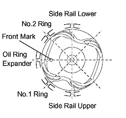 b. Position the piston rings so that the ring ends are as shown in the illustration.