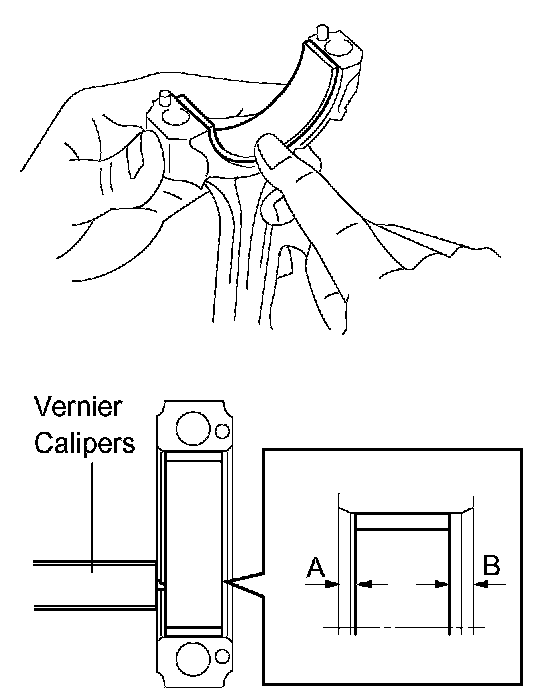 b. Using vernier calipers, measure the distance between the connecting rod's and bearing cap's edges, and each connecting rod bearing's edge.