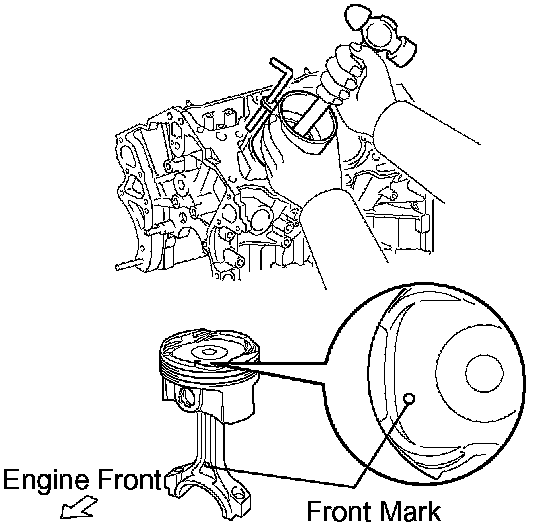 c. Using a piston ring compressor, push the correctly numbered piston and connecting rod assembly into the cylinder with the front mark of the piston facing forward.