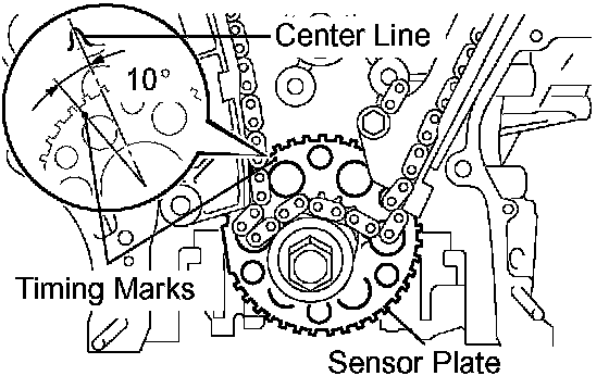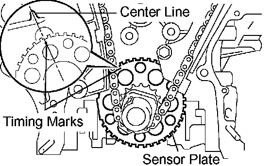 b. Set the timing mark on the crank angle sensor plate to the RH block bore center line. (TDC/compression)