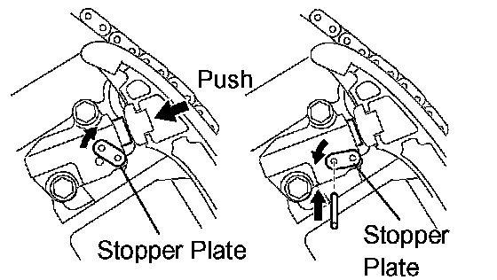 a. Move the stopper plate upward to release the lock, and push the plunger deep into the tensioner.