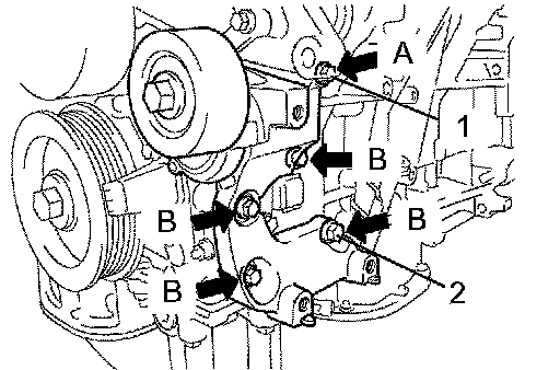 b. Install the V-ribbed belt tensioner by tightening the bolt 1 and bolt 2 in the order shown in the illustration.
