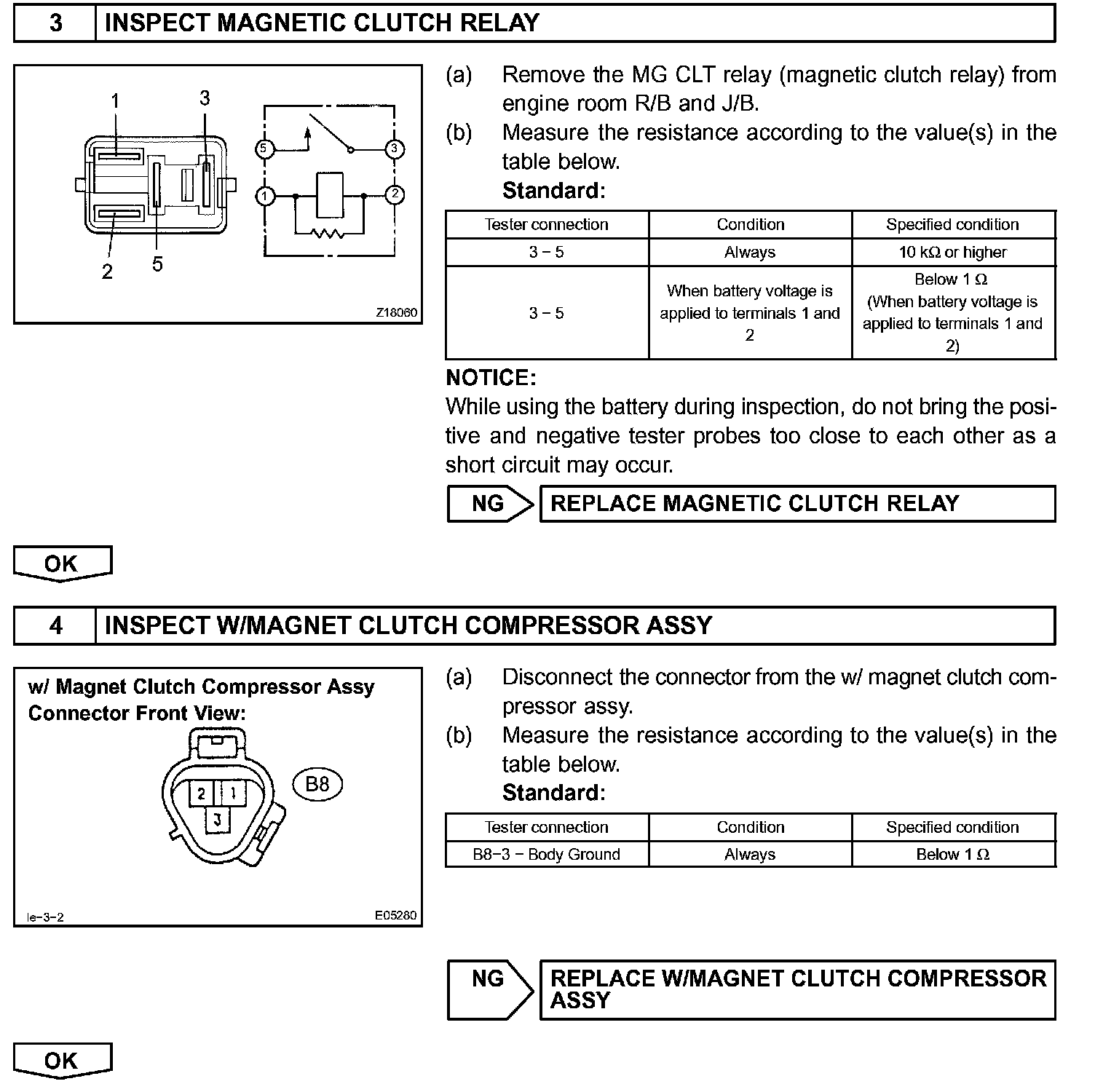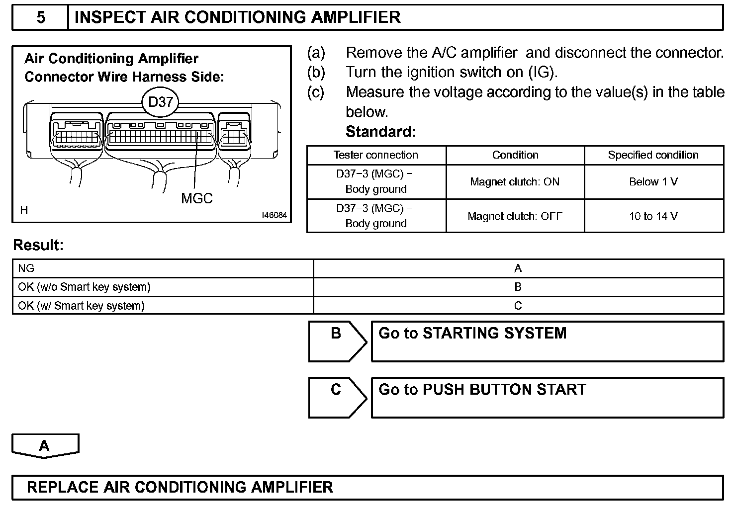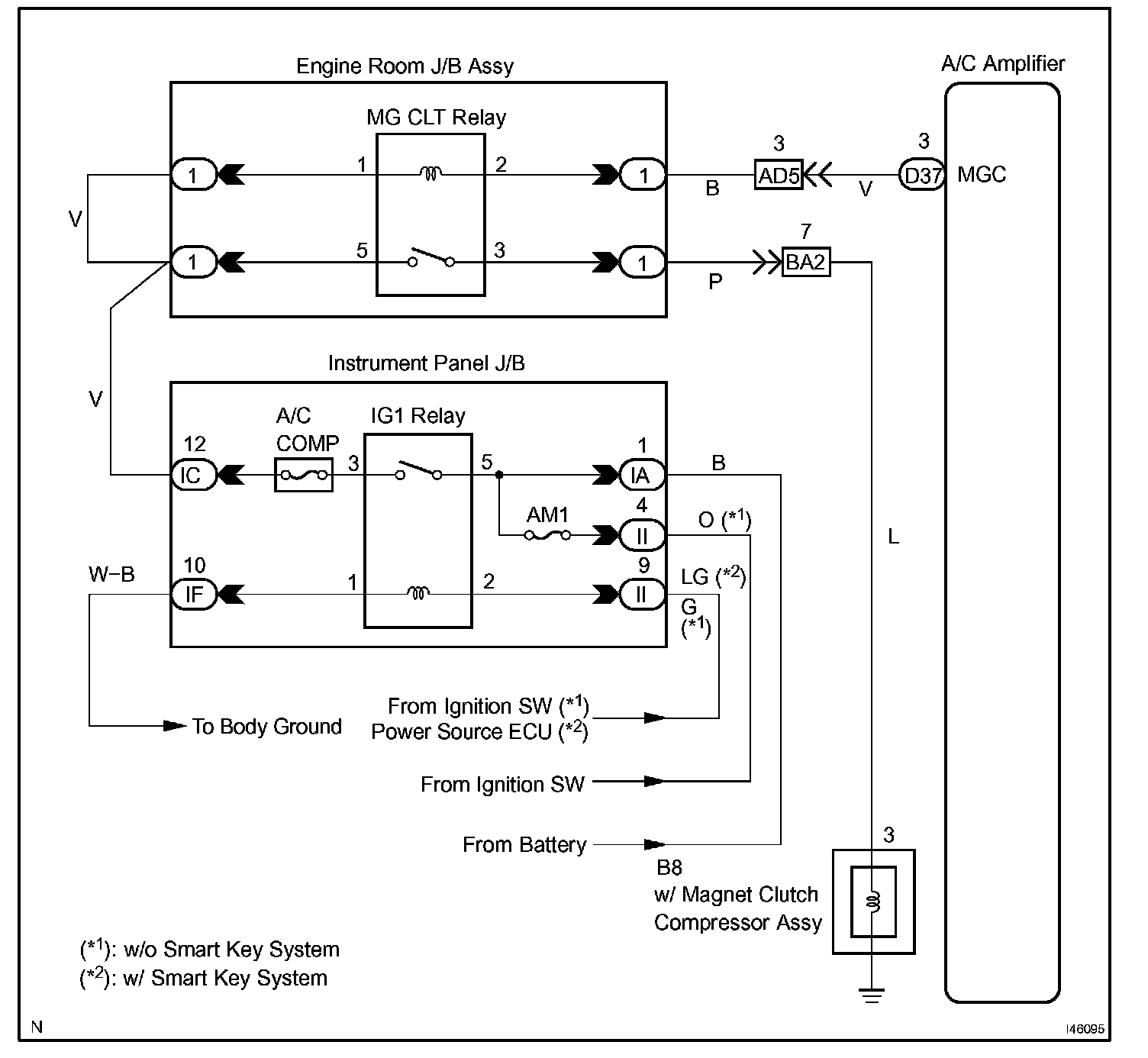 When the A/C switch is turned on, the magnetic clutch ON signal is sent from the MGC terminal of the A/C amplifier. Then, the MG CLT relay turns on to operate the magnetic clutch.