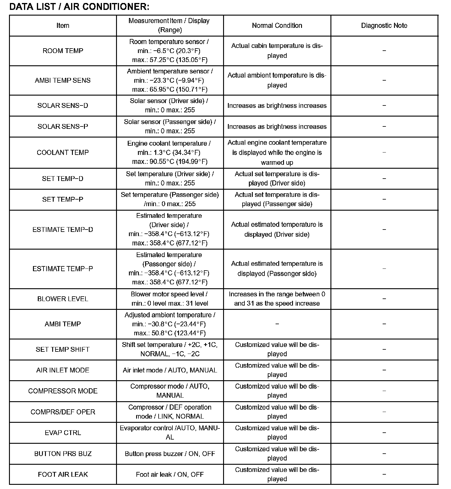DATA LISTHINT: From the DATA LIST displayed on the hand-held tester, you can read the values of the displays, sensors, actuators and so on without parts removal. Reading the DATA LIST as the first step of troubleshooting is one way to shorten labor time.