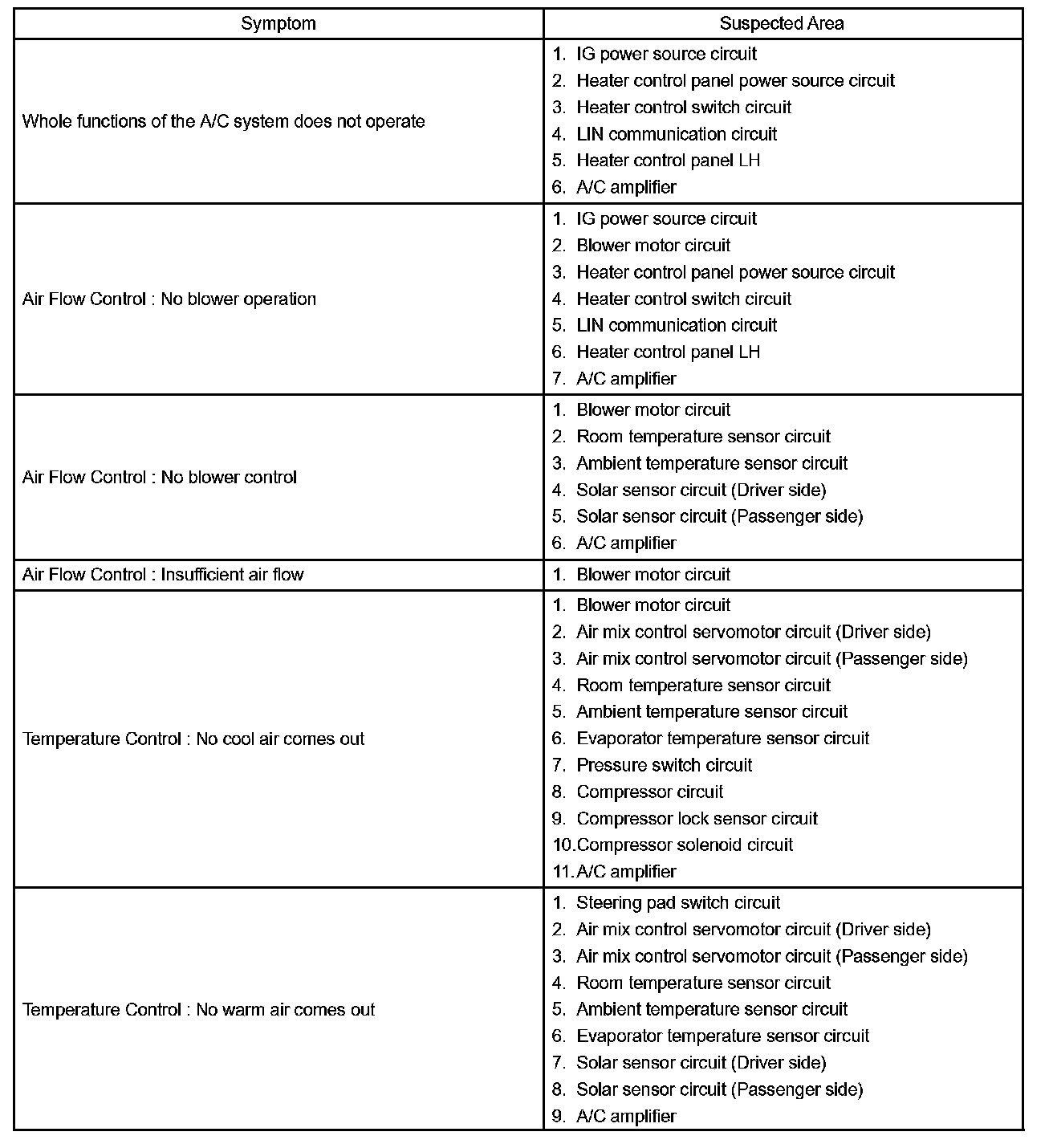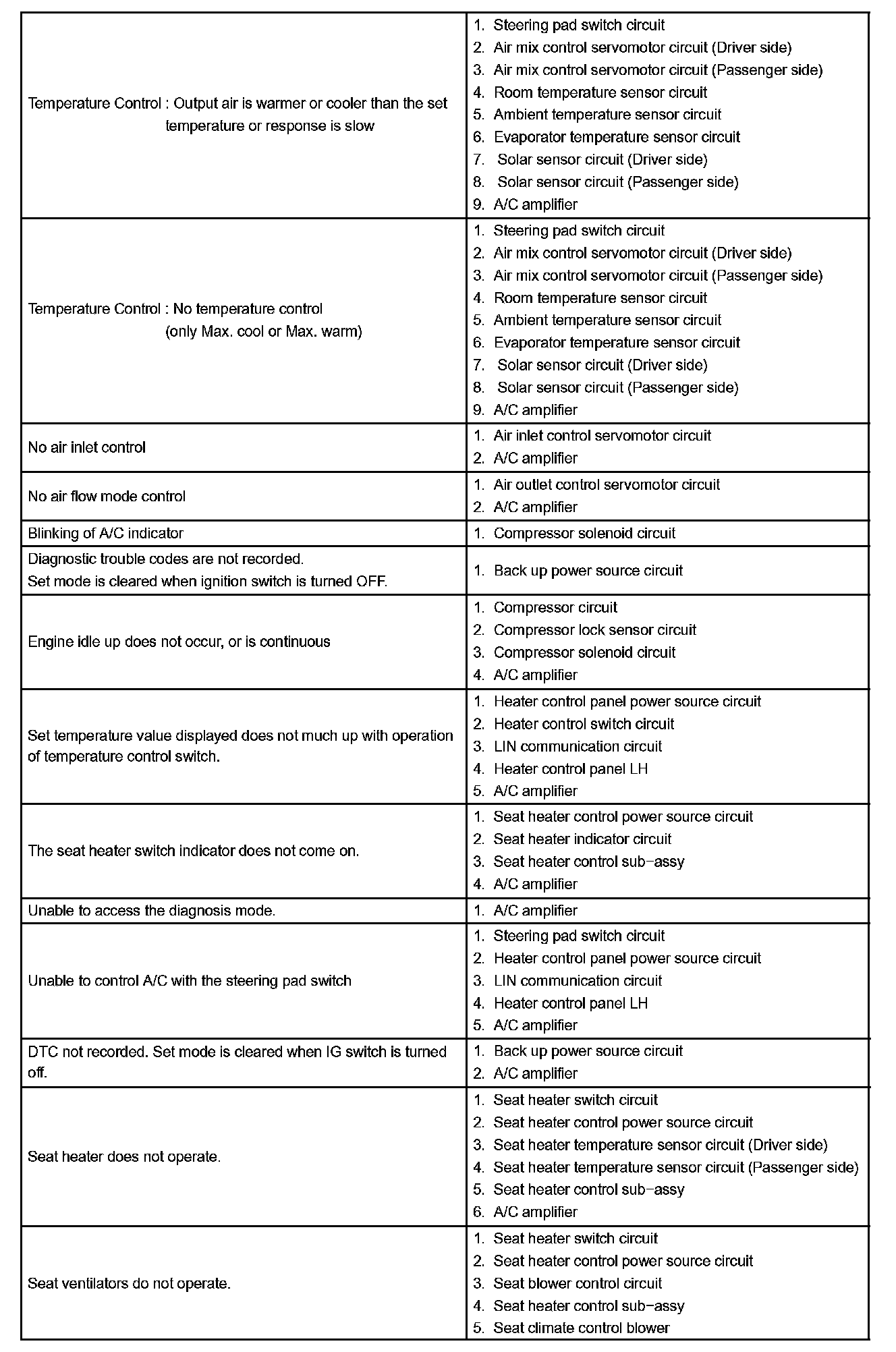 If a normal system code is displayed during the DTC check but the problem still occurs, check the circuits for each problem symptom in the order given in the table and proceed to the relevant troubleshooting.
