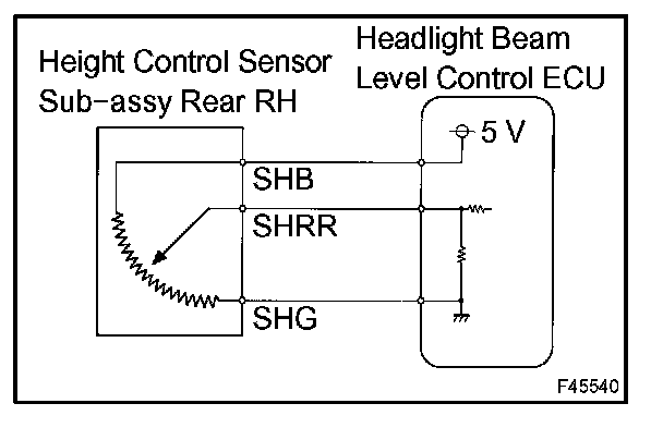 The height control sensor rear RH controls the resistance value based on changes in vehicle height. The headlight beam level control ECU detects the changes in vehicle height from the transformed voltage. The headlight beam level control ECU outputs a constant voltage of 5 V to the SHB terminal of the height control sensor rear RH.