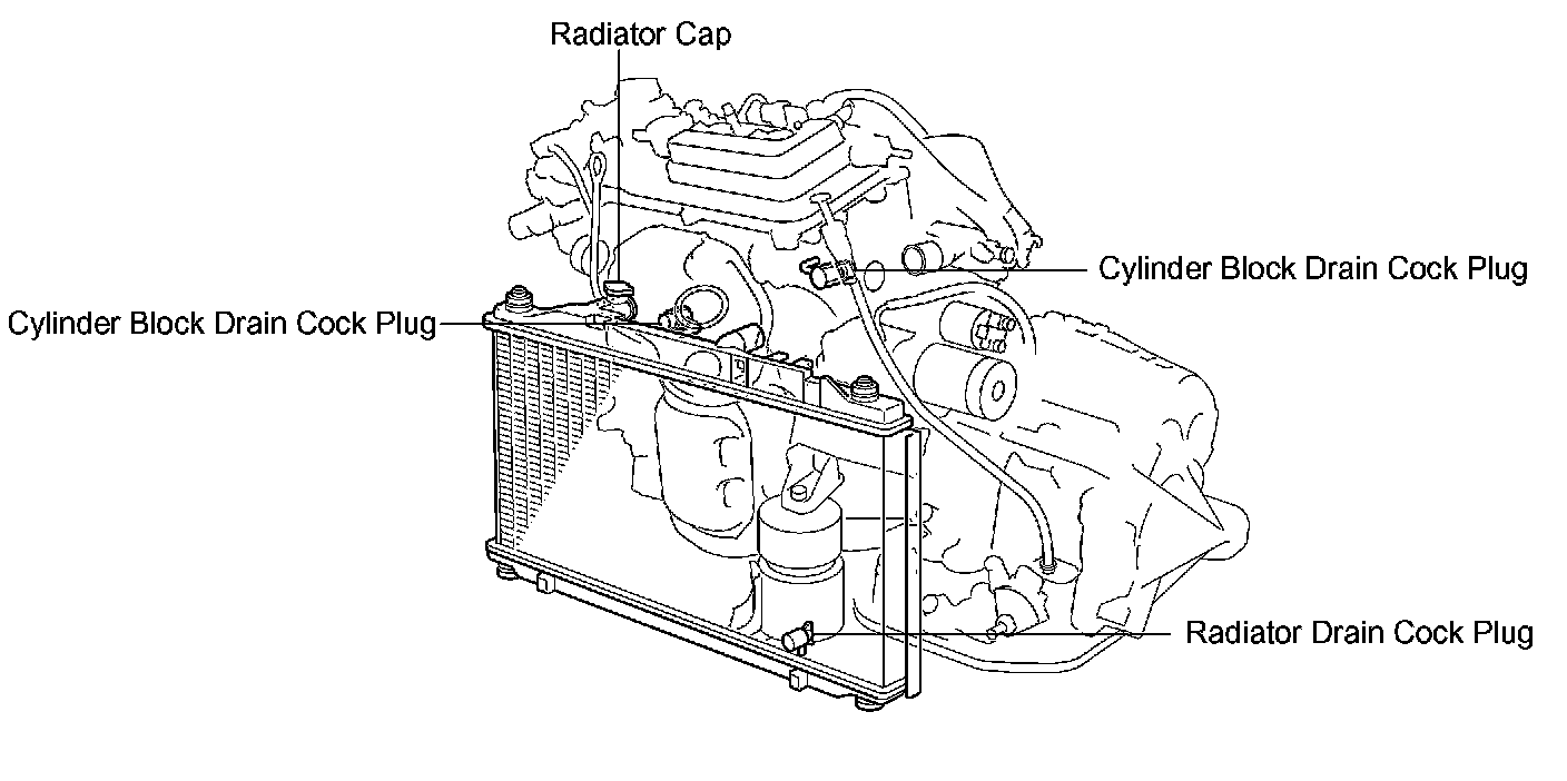 b. Drain engine coolant by loosening the radiator drain cock plug and the engine's cylinder block drain cock plug.
