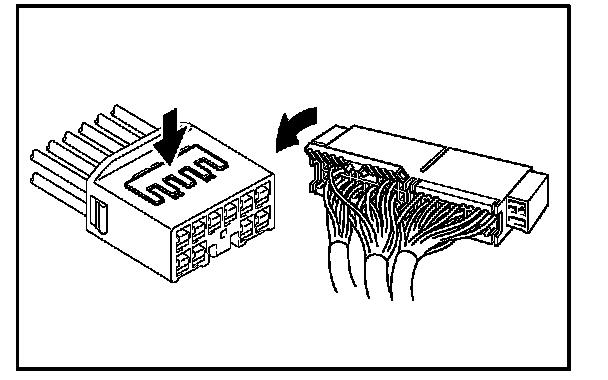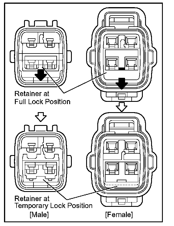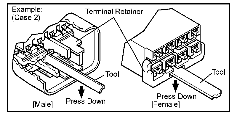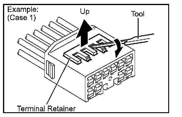 Insert the special tool into the terminal retainer access hole (/\Mark) and pull the terminal retainer up to the temporary lock position.