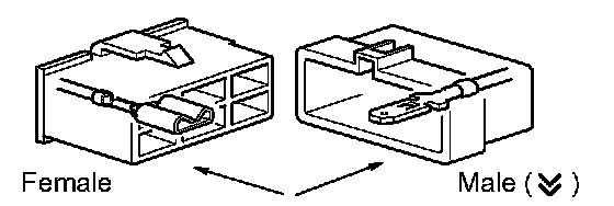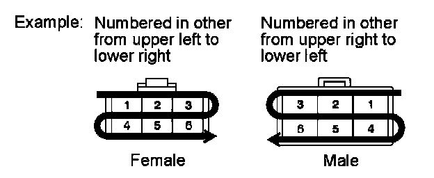 Symbol ( ) indicates the male terminal connector. Numbers outside connector codes indicate the pin numbers of both male and female connectors.