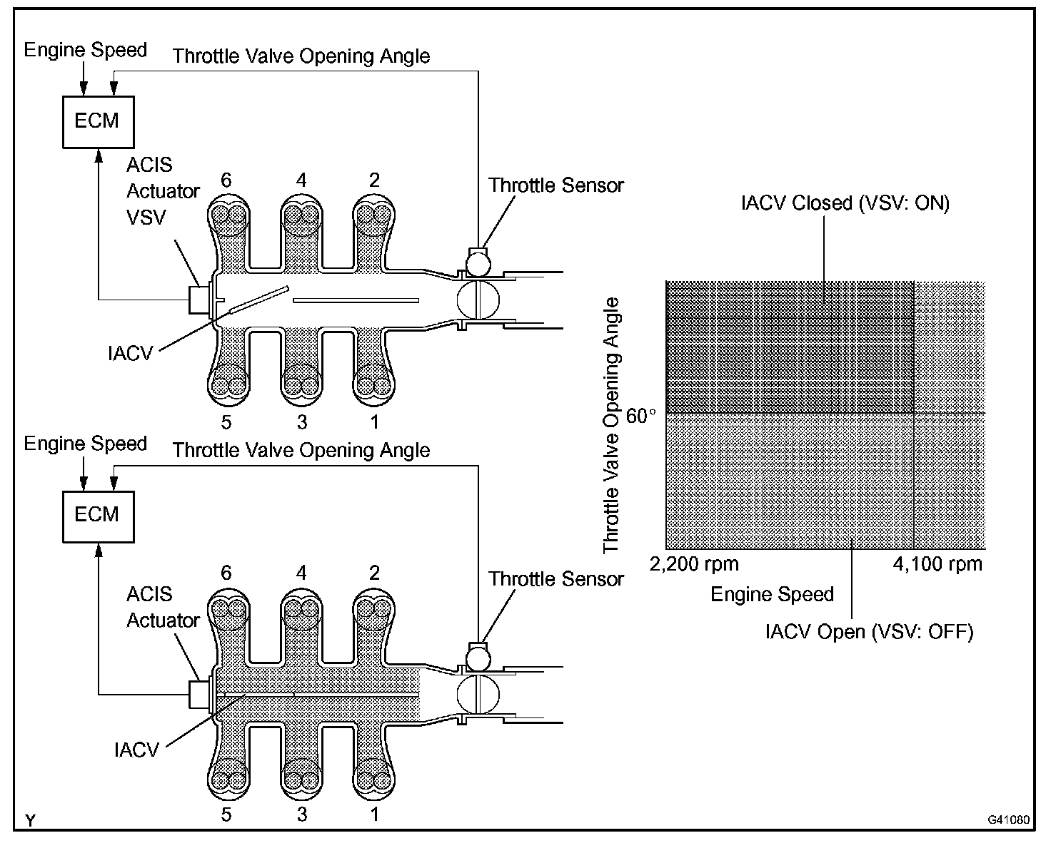 When the engine speed is between 2,200 and 4,100 rpm and the throttle valve opening angle is 60 degree or more, the ECM supplies current to the VSV (ON status), to close the IACV. Under other conditions, the VSV is usually OFF and the IACV is open.