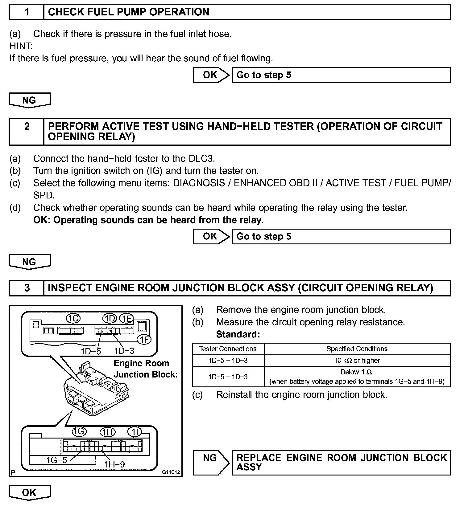 While the NE signal is generated (engine running), the ECM keeps Tr ON (circuit opening relay ON) and the fuel pump also keeps operating.