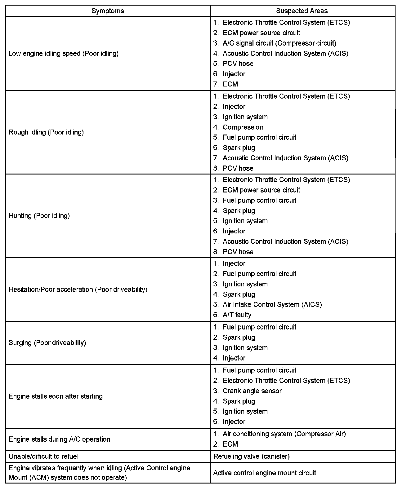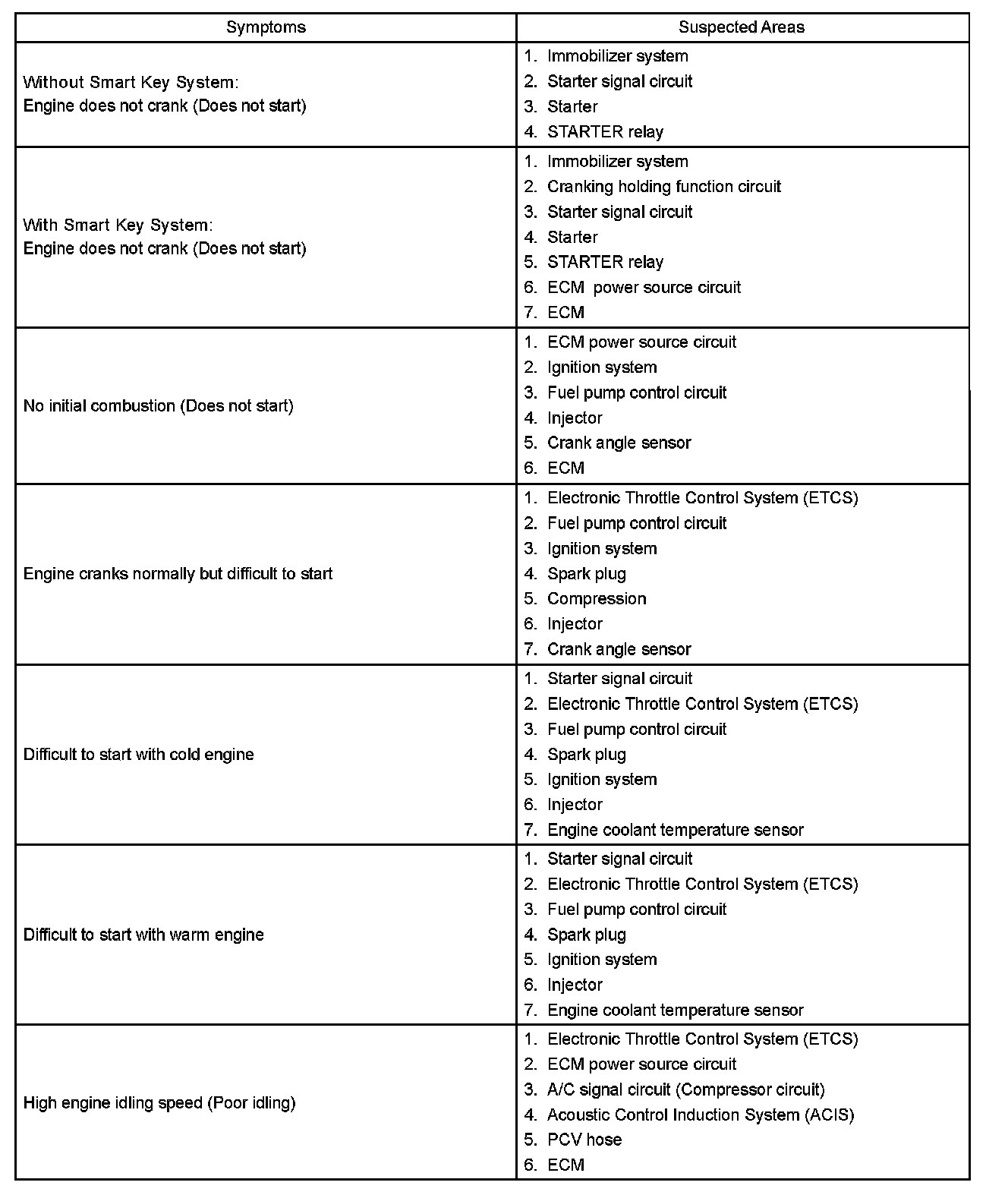 HINT: When a malfunction is not confirmed by a DTC (Diagnostic Trouble Code) check and the cause of problem cannot be identified through a basic inspection, troubleshoot according to the priority order indicated in the table.