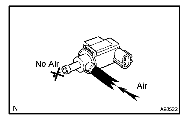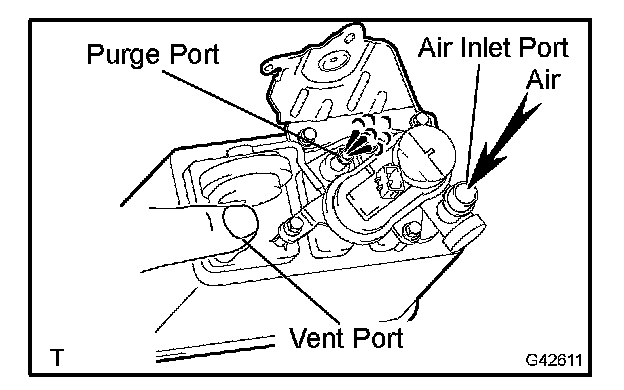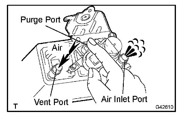 1. With the purge port closed, blow 1.67 kPa (17.0 gf/sq.cm, 0.24 psi) of air into the vent port, and check that air flows from the air inlet port.