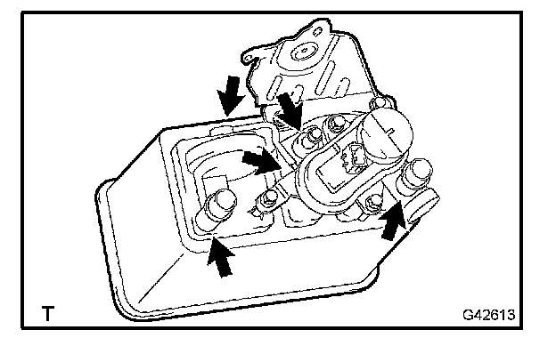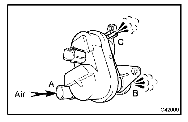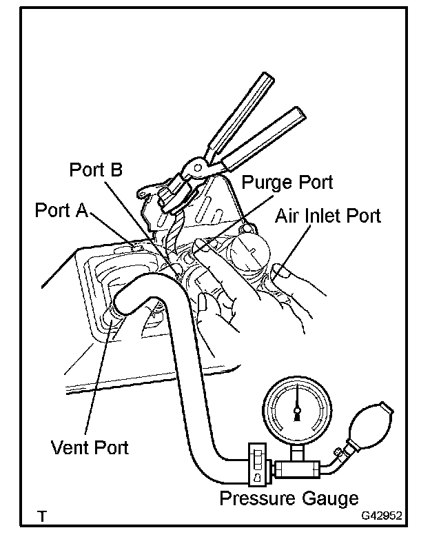 3. While holding port B, with the purge port and the air inlet port closed and port A open, apply pressurized air 19.6 kPa (0.2 kgf/sq.cm, 2.81 psi) into the vent port, then confirm that the pressure is retained for 1 minute.