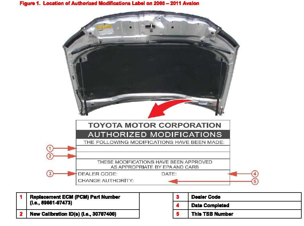 2. Check for the Authorized Modifications Label affixed to the vehicle in the location shown in Figure 1. Confirm if the ECM (PCM) calibration has been updated. If the calibration ID listed is NOT the latest ECM (PCM) calibration - go to step 3.
