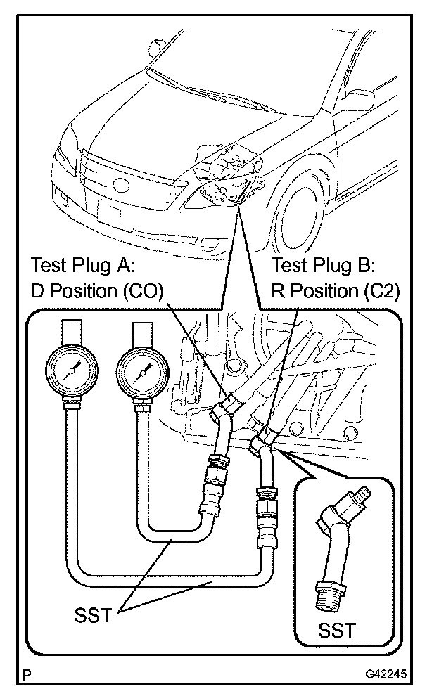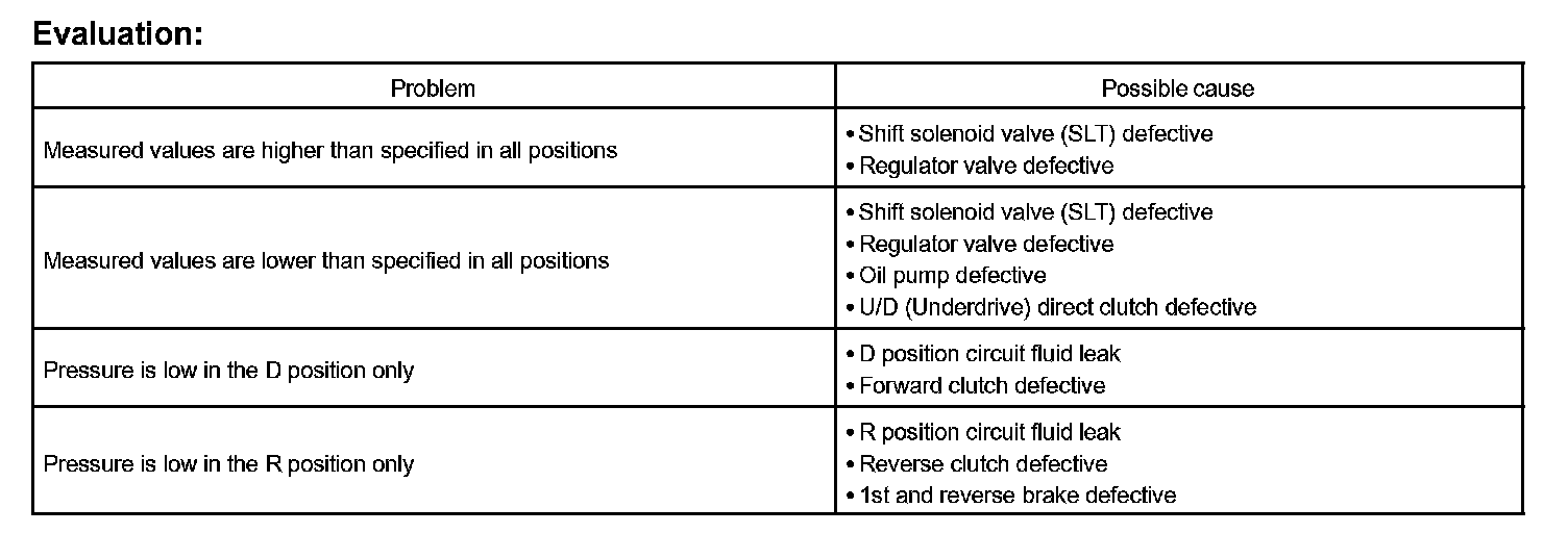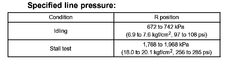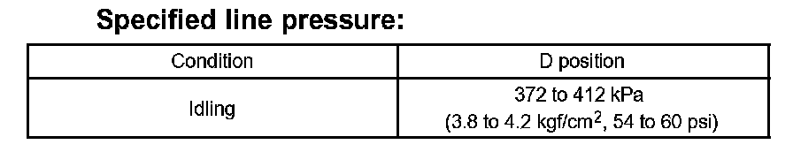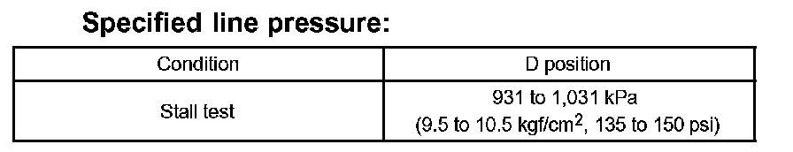 11. Firmly depress the brake pedal, shift to the D position, depress the accelerator pedal all the way down and check the line pressure while the stall test is performed.