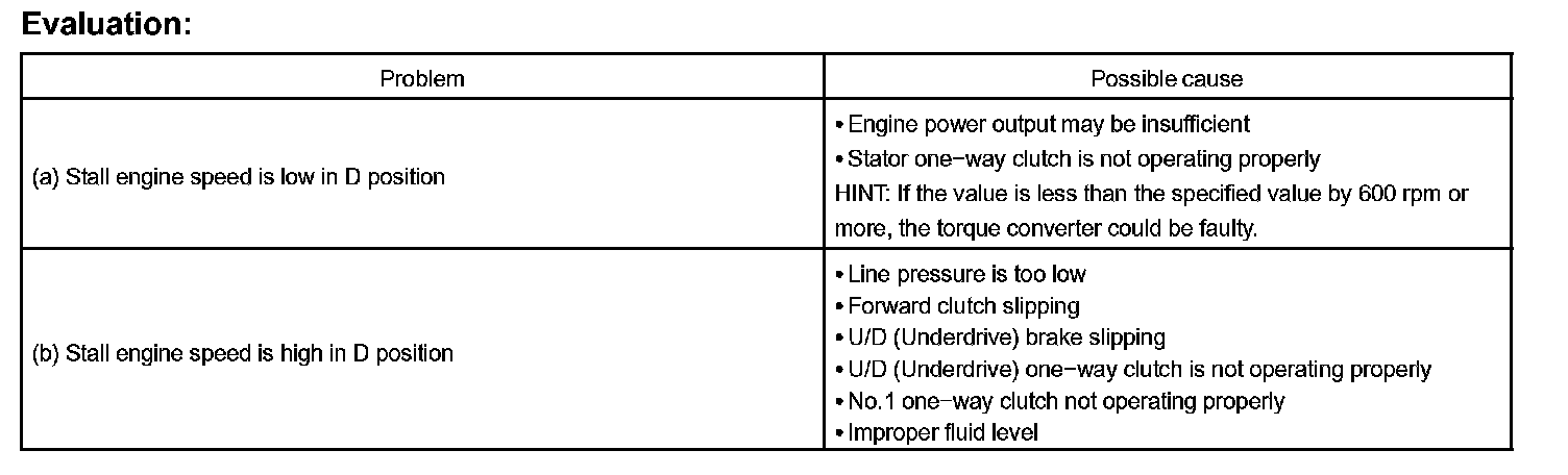 The object of this test is to check the overall performance of the transaxle and engine by measuring the stall speeds in the D position.