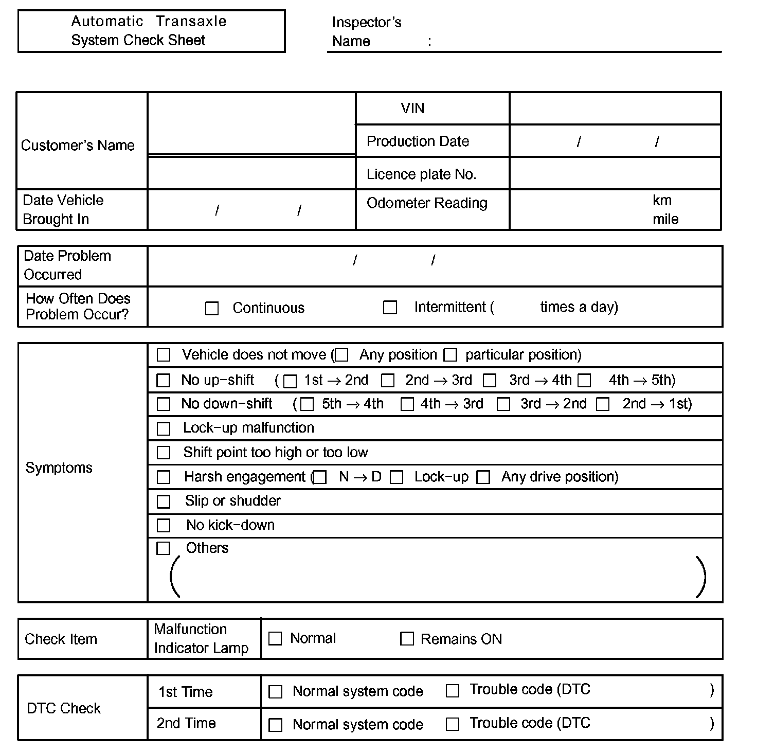 Automatic Transaxle System Check Sheet: