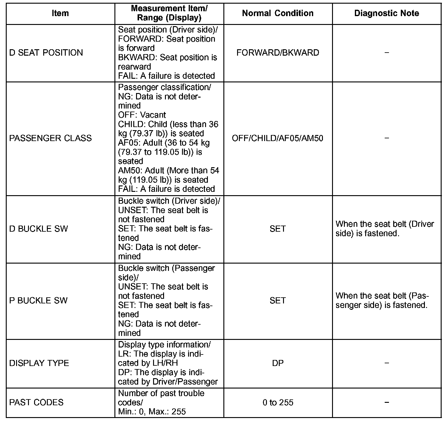2. DATA LIST FOR OCCUPANT CLASSIFICATION ECU