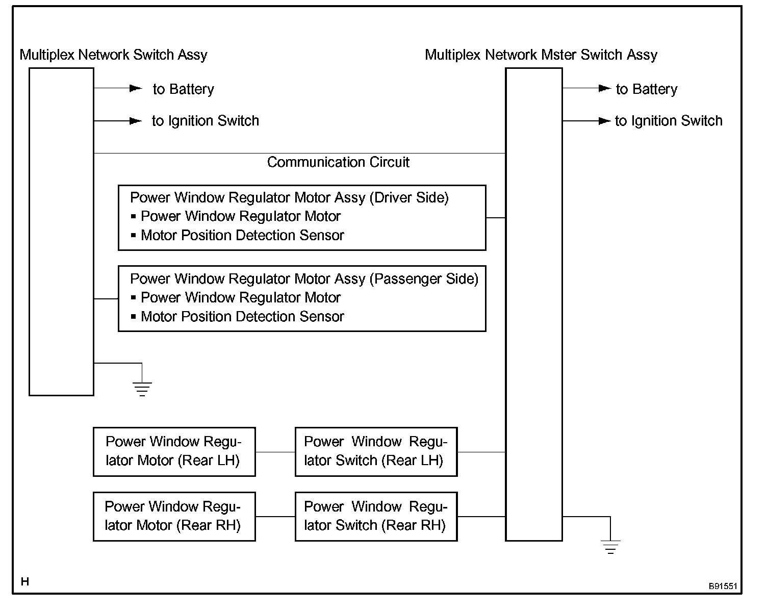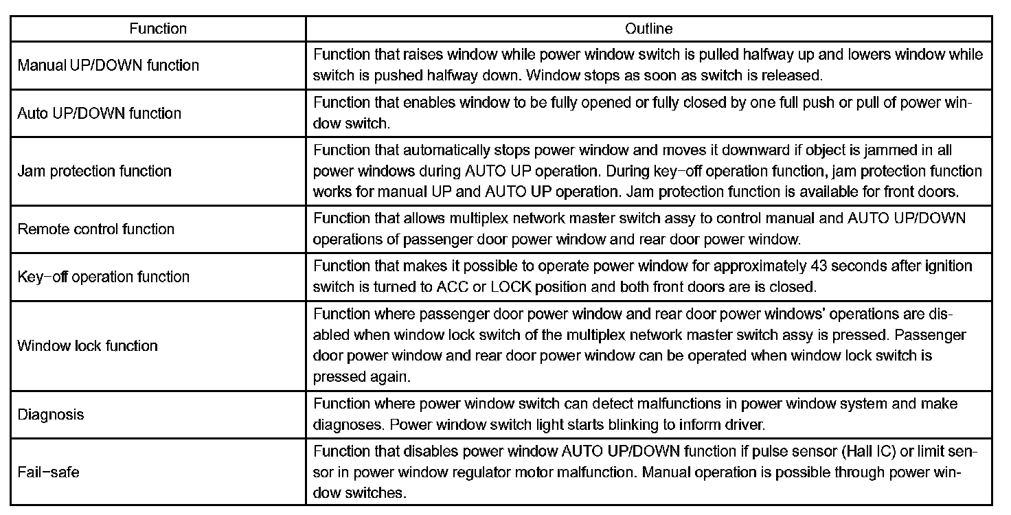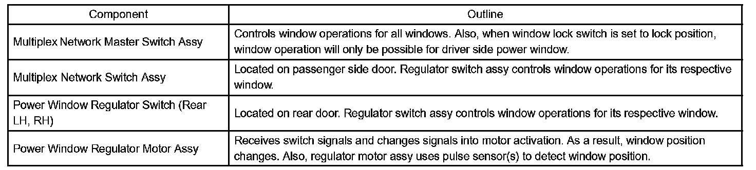 The main controls of this system are: the multiplex network master switch assembly, which is built into the driver side door, and the power window regulator switches, which are built into the passenger side door and rear doors. Pressing each regulator switch on the multiplex network master switch assembly transmits a remote UP/DOWN signal to each power window regulator switch.