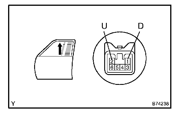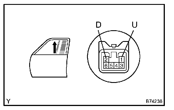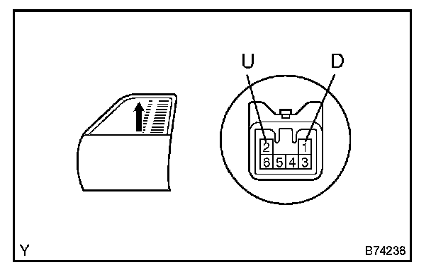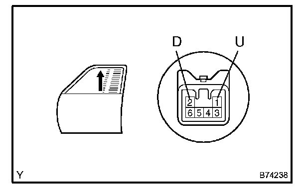 3. Connect the battery's positive (+) lead to terminal 1 (U) of the wire harness side connector, and raise the window to the fully closed position.