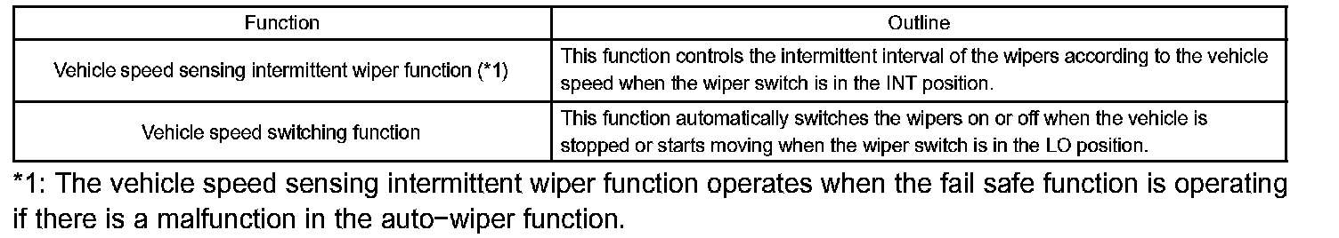 b. While the wipers are operating in intermittent mode from directions from the combination switch, the front controller adjusts the interval between movements of the wiper arm, according to vehicle speed, brake signals, and driving and stopping conditions. The system has the given functions:
