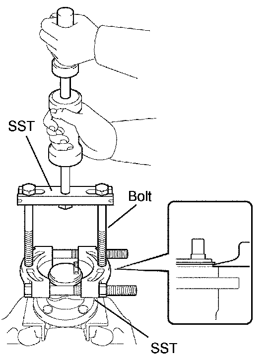 b. Using a pin punch and hammer, drive out the 2 pins and remove the 2 attachments from SST