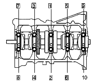 a) Uniformly loosen and remove the 10 main bearing cap bolt in the sequence shown in the illustration.