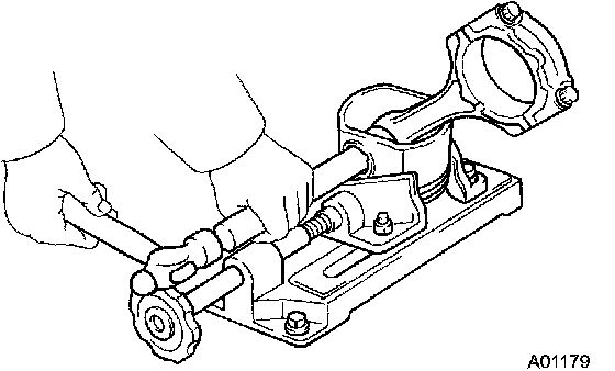 b) Using a plastic-faced hammer and brass bar, lightly tap out the piston pin and remove the connecting rod.