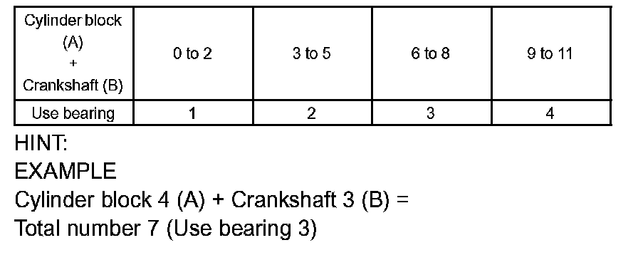 k) If using a standard bearing, replace it with one having the same number. If the number of the bearing cannot be determined, select the correct bearing by adding together the numbers imprinted on the cylinder block and crankshaft, and then selecting the bearing according to the chart. There are 4 sizes of standard bearings: 1, 2, 3 and 4